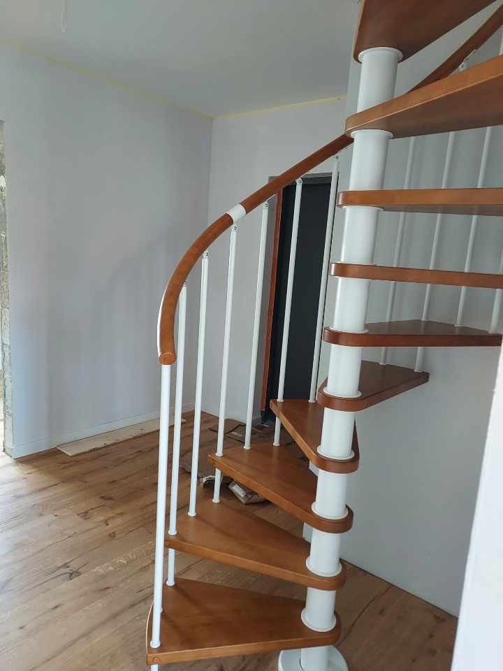 Sada točitých schodů přizpůsobená průměru otvoru ve stropě 200 cm. Prvky jsou vyrobeny z masivního dřeva (barva na výběr z barevné palety výrobce) a bílé práškově lakované oceli. Můžete si je sestavit sami, ale výrobce poskytuje za příplatek i službu montáže.
