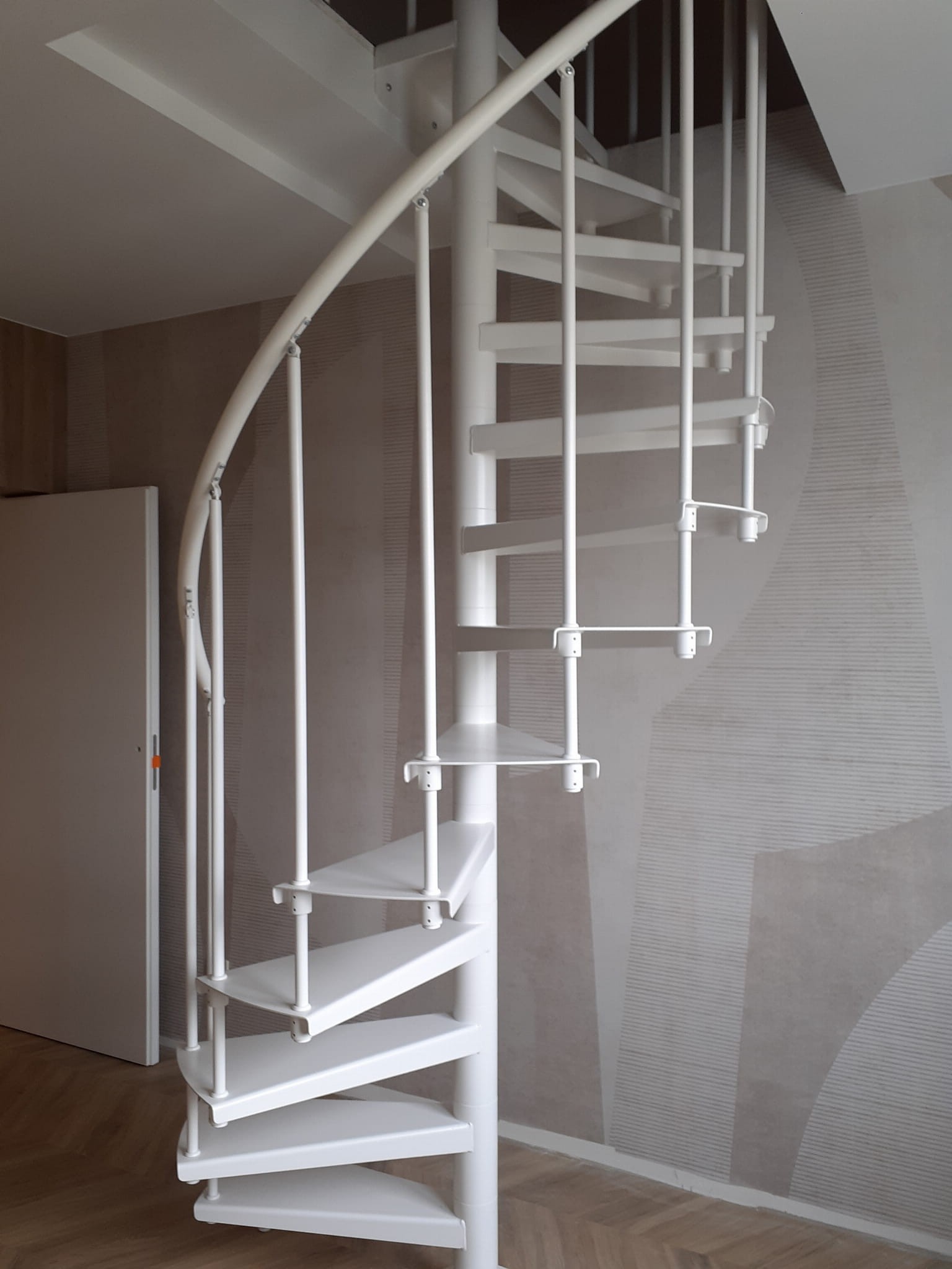 Sada točitých schodů přizpůsobená průměru otvoru ve stropě 170 cm. Prvky jsou vyrobeny z kostkovaného plechu a oceli s práškovým nástřikem v bílé barvě (RAL 9003). Můžete si je sestavit sami, ale výrobce poskytuje za příplatek i službu montáže.