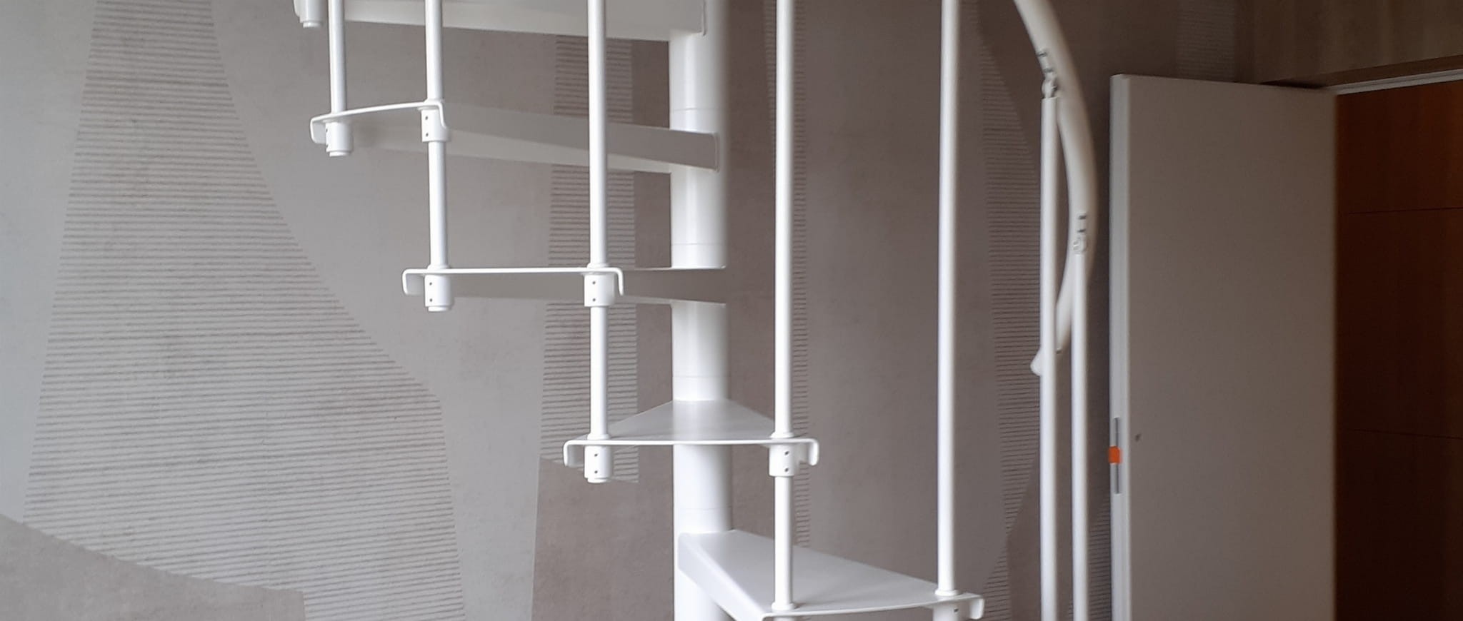 Sada točitých schodů přizpůsobená průměru otvoru ve stropě 180 cm. Prvky jsou vyrobeny z kostkovaného plechu a oceli s práškovým nástřikem v bílé barvě (RAL 9003). Můžete si je sestavit sami, ale výrobce poskytuje za příplatek i službu montáže.