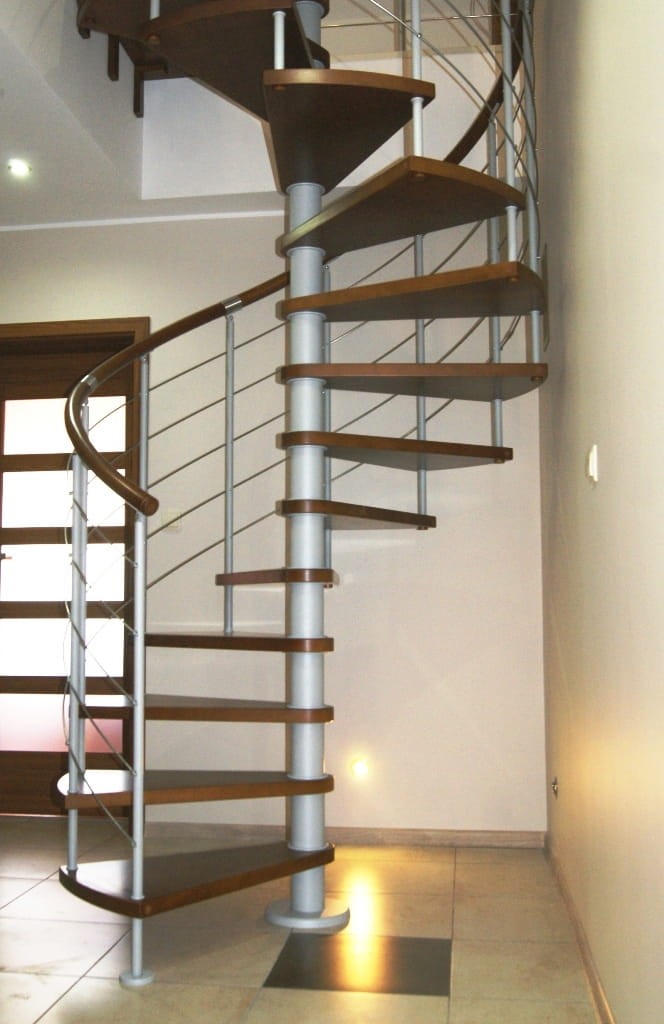 Sada točitých schodů přizpůsobená průměru otvoru ve stropě 200 cm. Prvky jsou vyrobeny z masivního dřeva (barva na výběr z barevné palety výrobce) a práškově lakované oceli ve stříbrné matné struktuře. Můžete si je sestavit sami, ale výrobce poskytuje za příplatek i službu montáže.