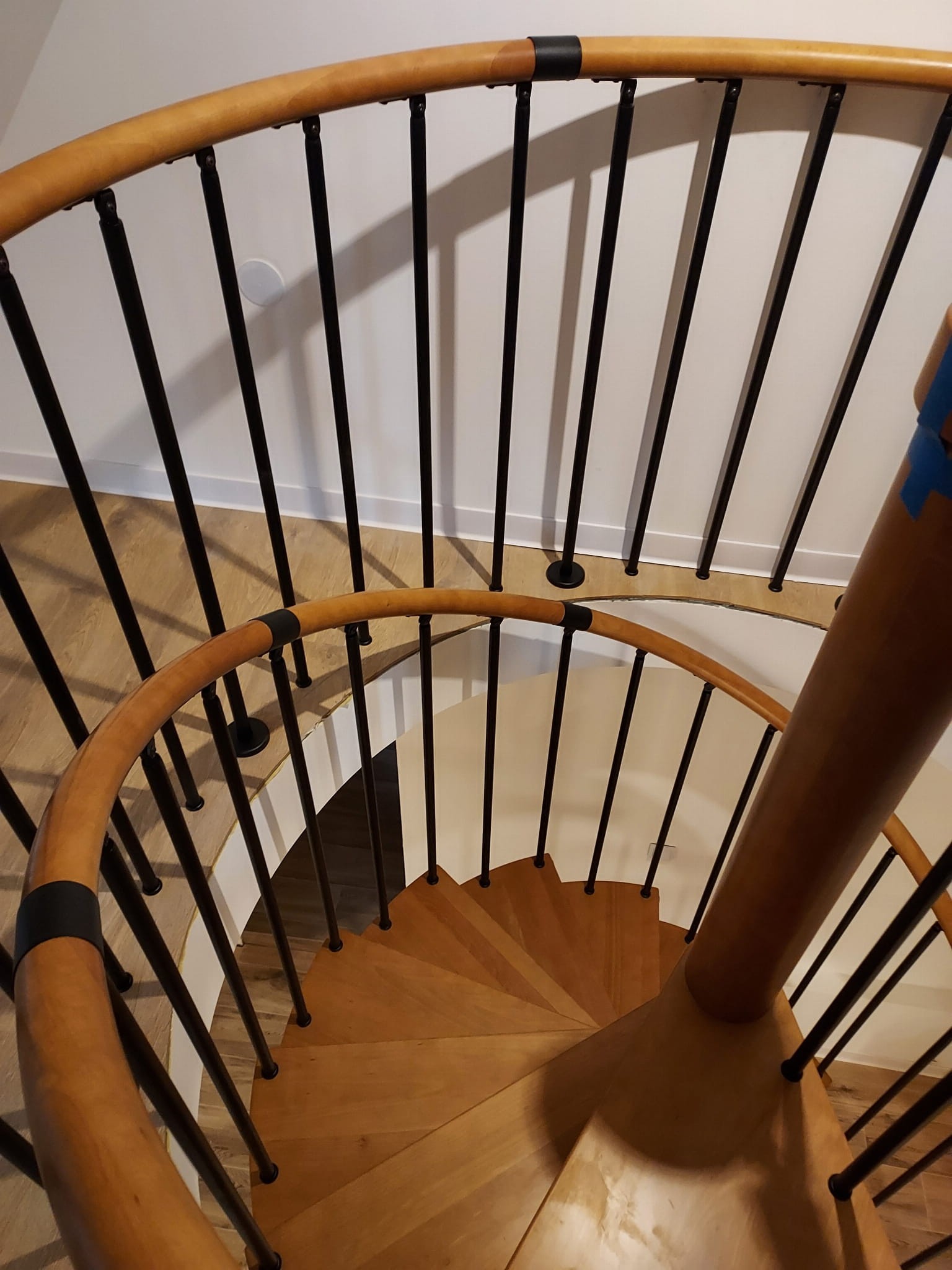 Sada točitých schodů přizpůsobená průměru otvoru ve stropě 130 cm. Prvky jsou vyrobeny z masivního dřeva (barva na výběr z barevné palety výrobce) a práškově lakované oceli v matně černé struktuře. Můžete si je sestavit sami, ale výrobce poskytuje za příplatek i službu montáže.