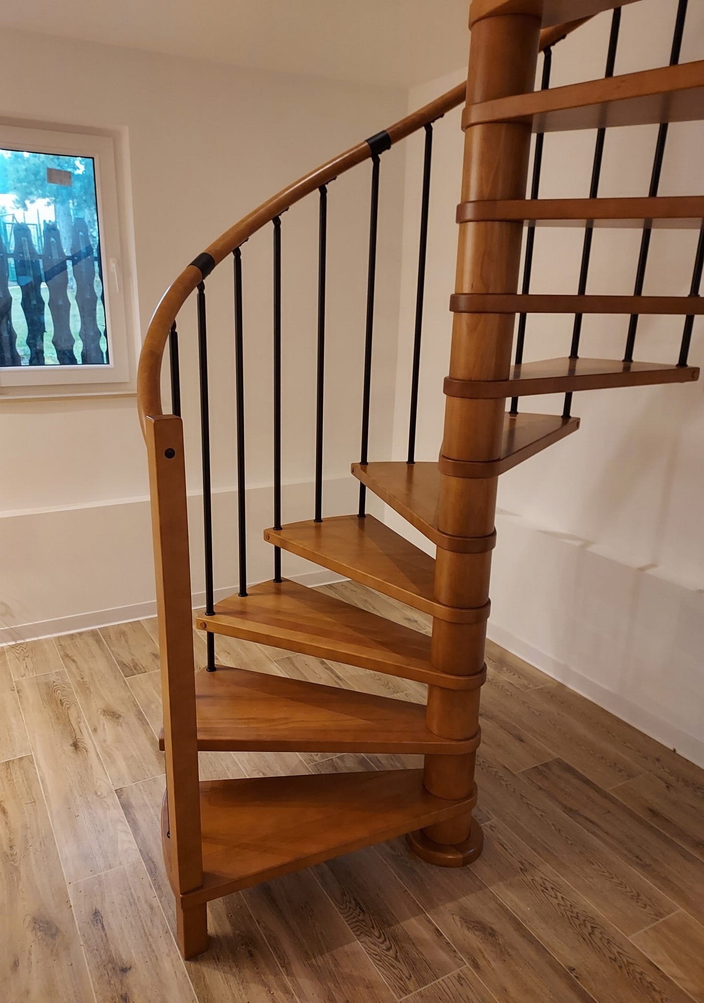 Sada točitých schodů přizpůsobená průměru otvoru ve stropě 140 cm. Prvky jsou vyrobeny z masivního dřeva (barva na výběr z barevné palety výrobce) a práškově lakované oceli v matně černé struktuře. Můžete si je sestavit sami, ale výrobce poskytuje za příplatek i službu montáže.