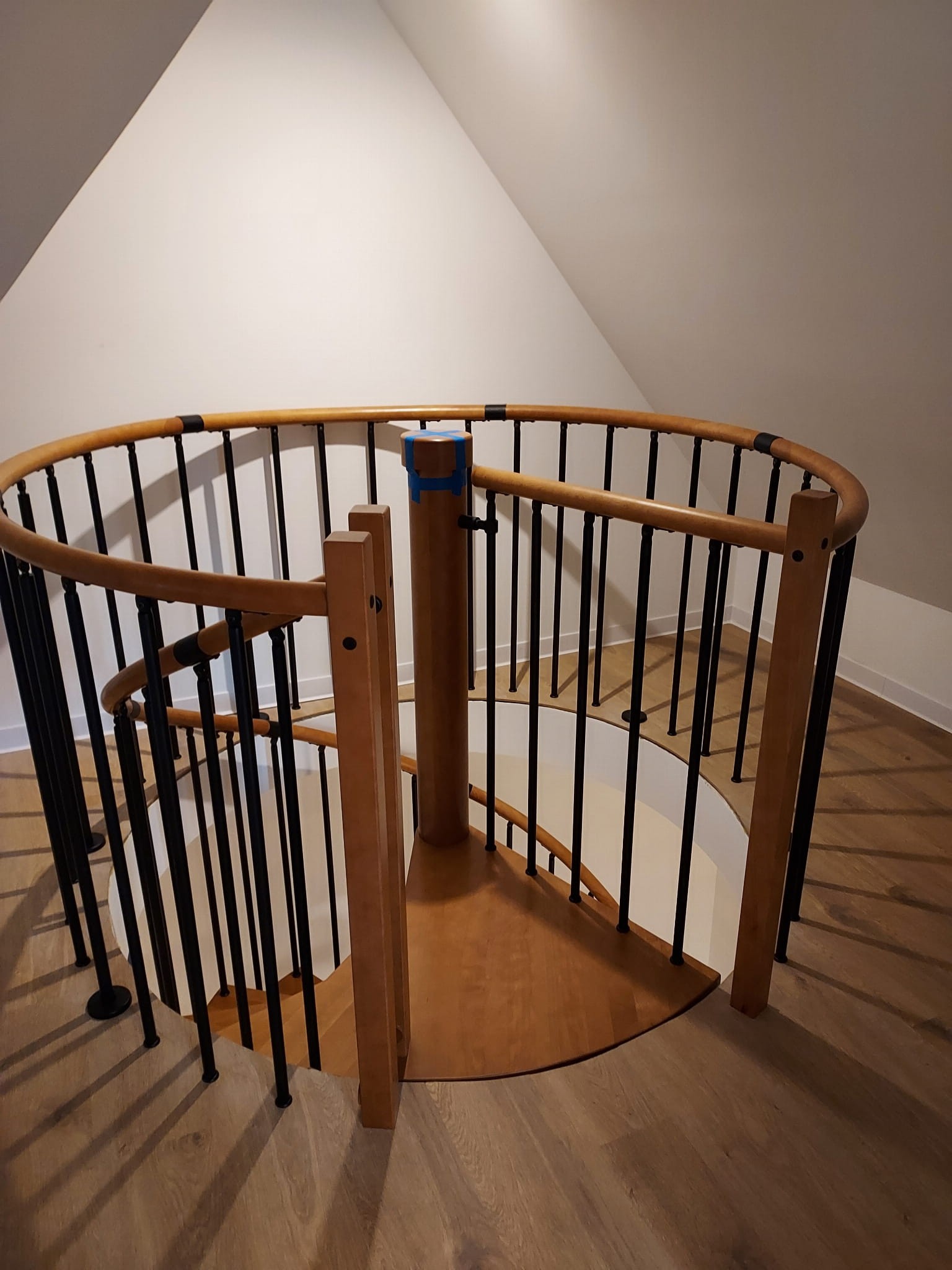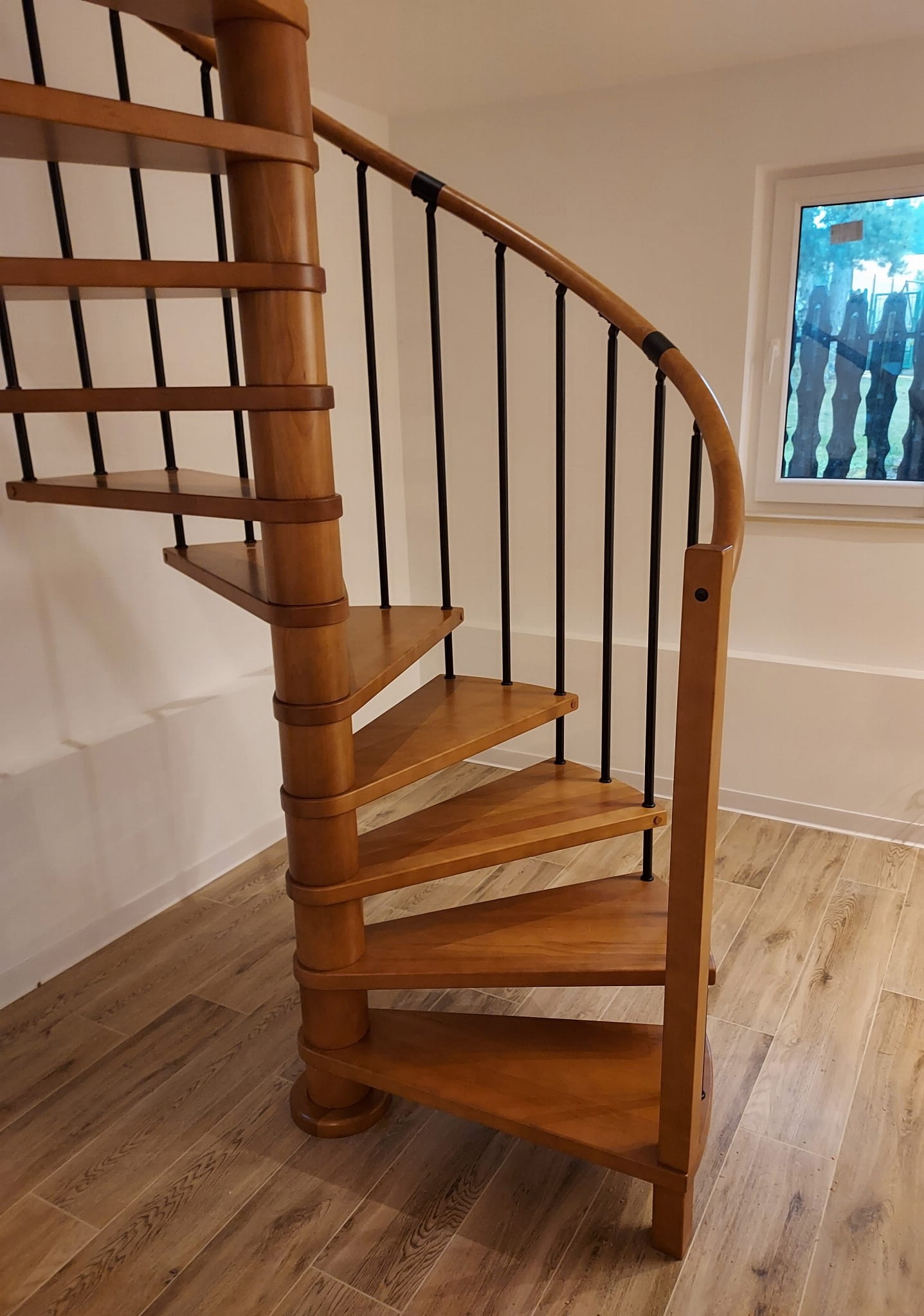 Sada točitých schodů přizpůsobená průměru otvoru ve stropě 150 cm. Prvky jsou vyrobeny z masivního dřeva (barva na výběr z barevné palety výrobce) a práškově lakované oceli v matně černé struktuře. Můžete si je sestavit sami, ale výrobce poskytuje za příplatek i službu montáže.