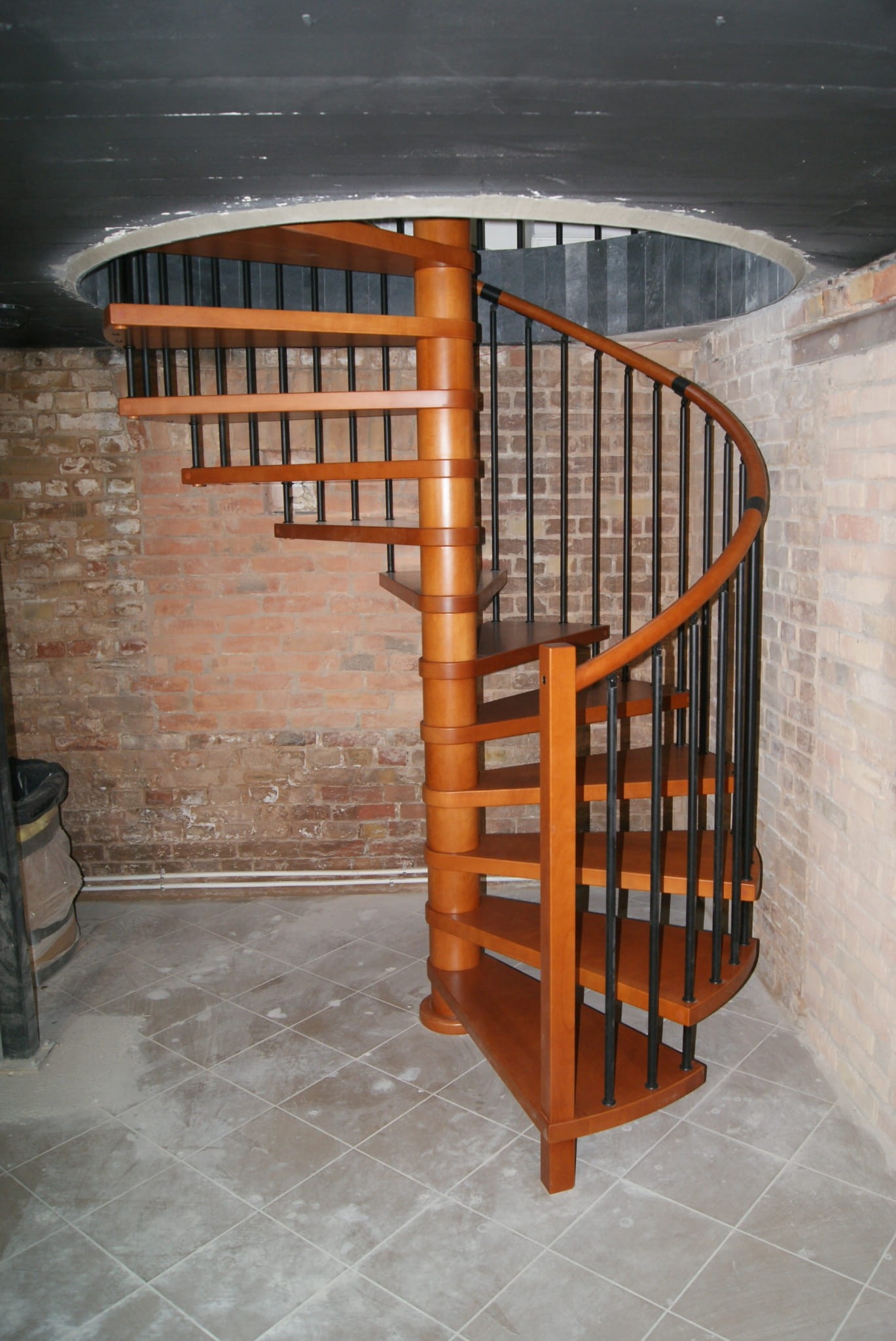 Sada točitých schodů přizpůsobená průměru otvoru ve stropě 210 cm. Prvky jsou vyrobeny z masivního dřeva (barva na výběr z barevné palety výrobce) a práškově lakované oceli v matně černé struktuře. Můžete si je sestavit sami, ale výrobce poskytuje za příplatek i službu montáže.