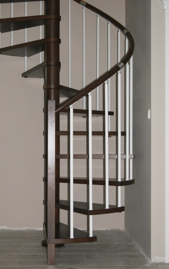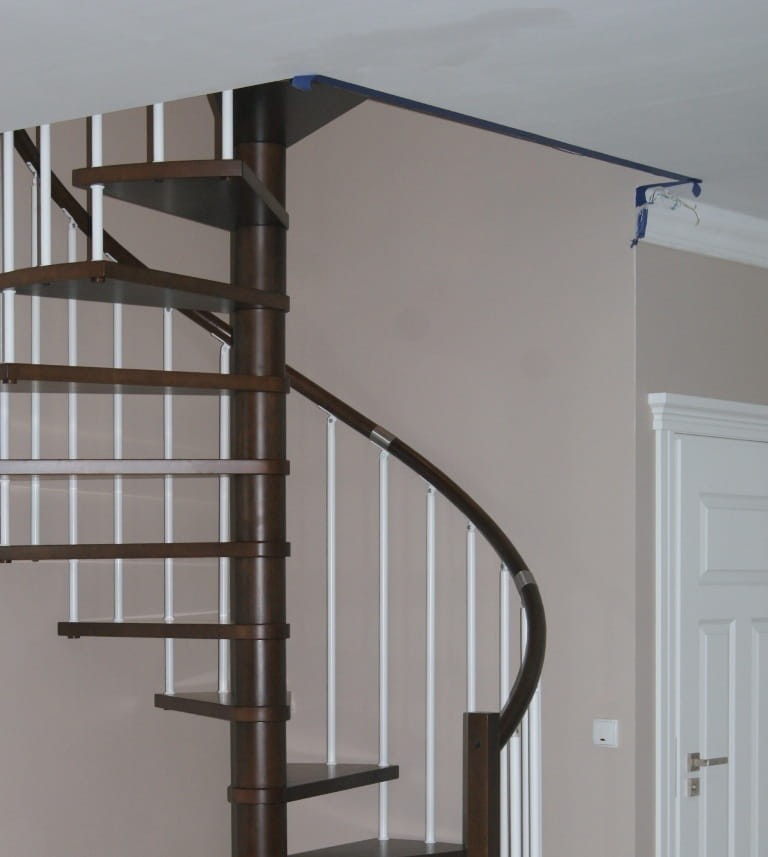 Sada točitých schodů přizpůsobená průměru otvoru ve stropě 130 cm. Prvky jsou vyrobeny z masivního dřeva (barva na výběr z barevné palety výrobce) a práškově lakované oceli v bílé matné struktuře. Můžete si je sestavit sami, ale výrobce poskytuje za příplatek i službu montáže.