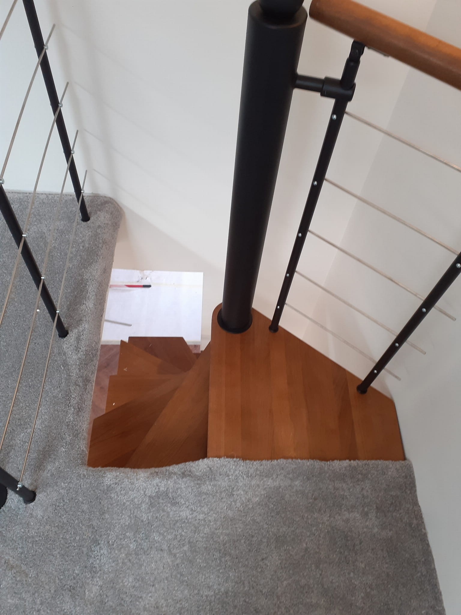 Sada točitých schodů přizpůsobená průměru otvoru ve stropě 140 cm. Prvky jsou vyrobeny z masivního dřeva (barva na výběr z barevné palety výrobce) a práškově lakované oceli v černé matné struktuře. Můžete si je sestavit sami, ale výrobce poskytuje za příplatek i službu montáže.