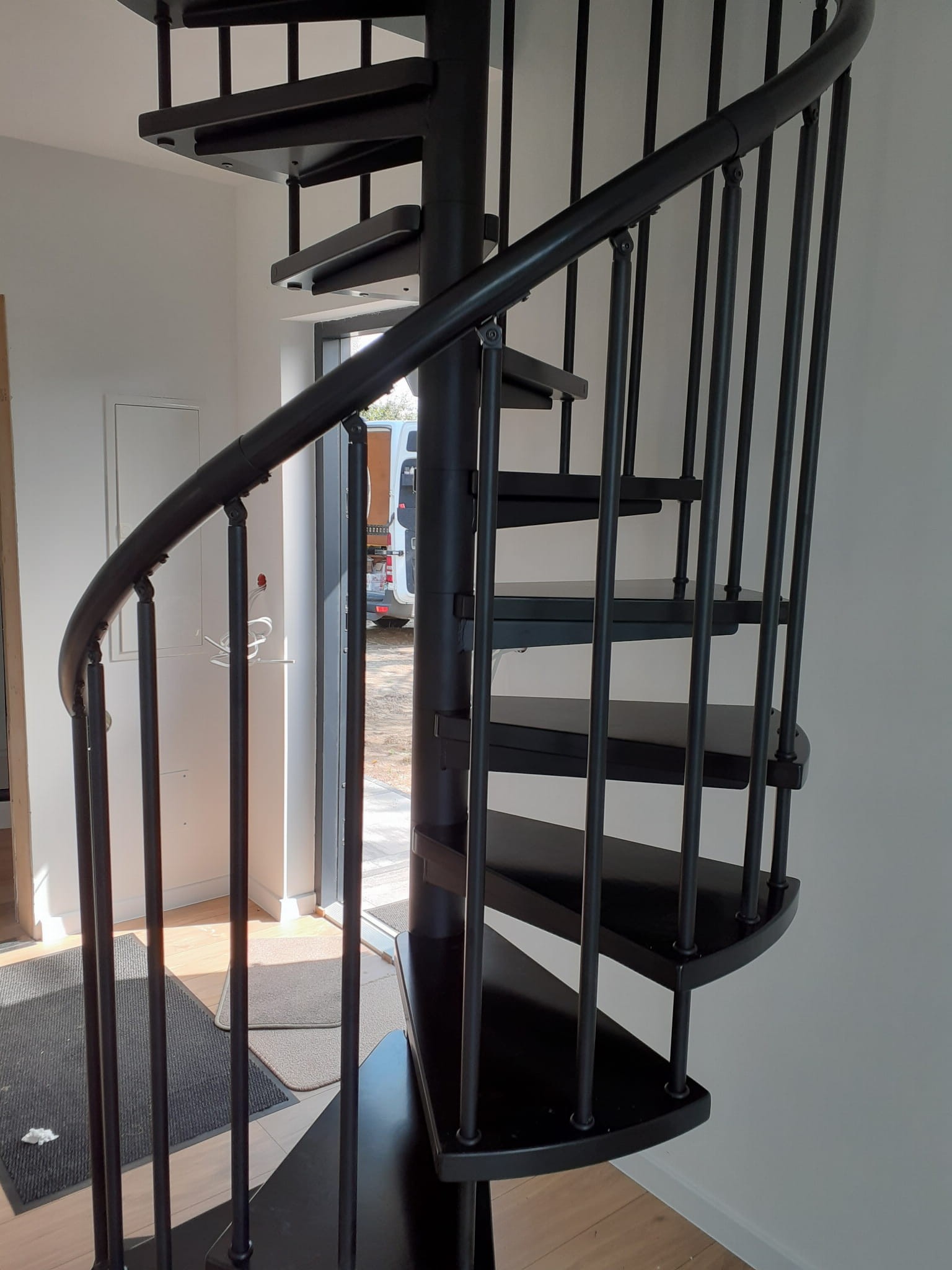 Sada točitých schodů přizpůsobená průměru otvoru ve stropě 150 cm. Prvky jsou vyrobeny z masivního dřeva (barva na výběr z barevné palety výrobce) a práškově lakované oceli v matně černé struktuře. Můžete si je sestavit sami, ale výrobce poskytuje za příplatek i službu montáže.