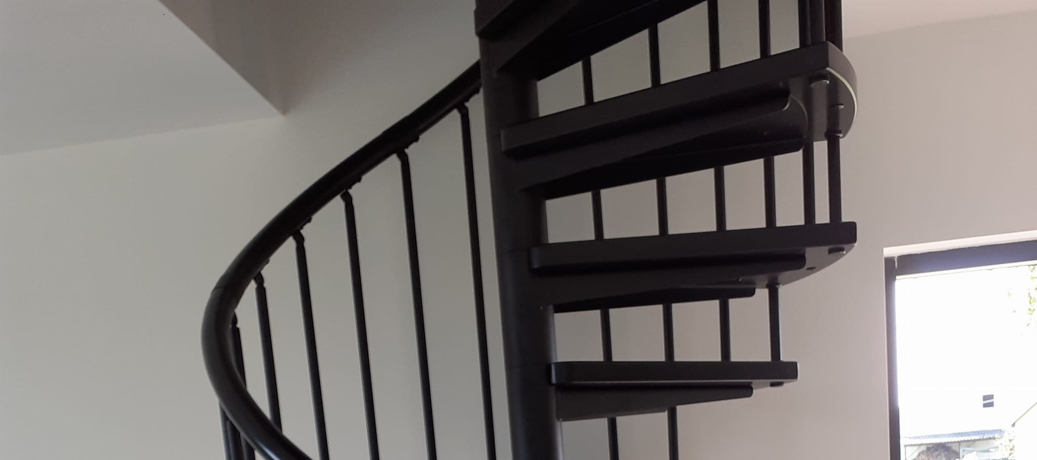 Sada točitých schodů přizpůsobená průměru otvoru ve stropě 180 cm. Prvky jsou vyrobeny z masivního dřeva (barva na výběr z barevné palety výrobce) a práškově lakované oceli v matně černé struktuře. Můžete si je sestavit sami, ale výrobce poskytuje za příplatek i službu montáže.