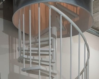 Sada točitých schodů přizpůsobená průměru otvoru ve stropě 120 cm. Prvky jsou vyrobeny z masivního dřeva (barva na výběr z barevné palety výrobce) a práškově lakované oceli v matně černé struktuře. Můžete si je sestavit sami, ale výrobce poskytuje za příplatek i službu montáže.