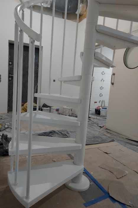 Sada točitých schodů přizpůsobená průměru otvoru ve stropě 180 cm. Prvky jsou vyrobeny z masivního dřeva (barva na výběr z barevné palety výrobce) a práškově lakované oceli v matně černé struktuře. Můžete si je sestavit sami, ale výrobce poskytuje za příplatek i službu montáže.