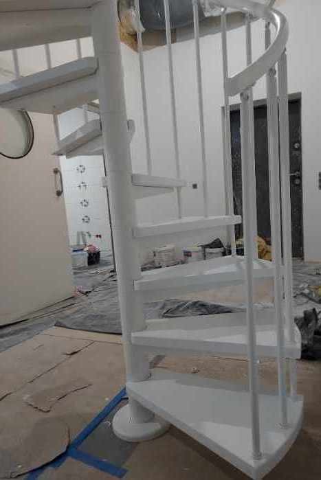Sada točitých schodů přizpůsobená průměru otvoru ve stropě 210 cm. Prvky jsou vyrobeny z masivního dřeva (barva na výběr z barevné palety výrobce) a práškově lakované oceli v matně černé struktuře. Můžete si je sestavit sami, ale výrobce poskytuje za příplatek i službu montáže.