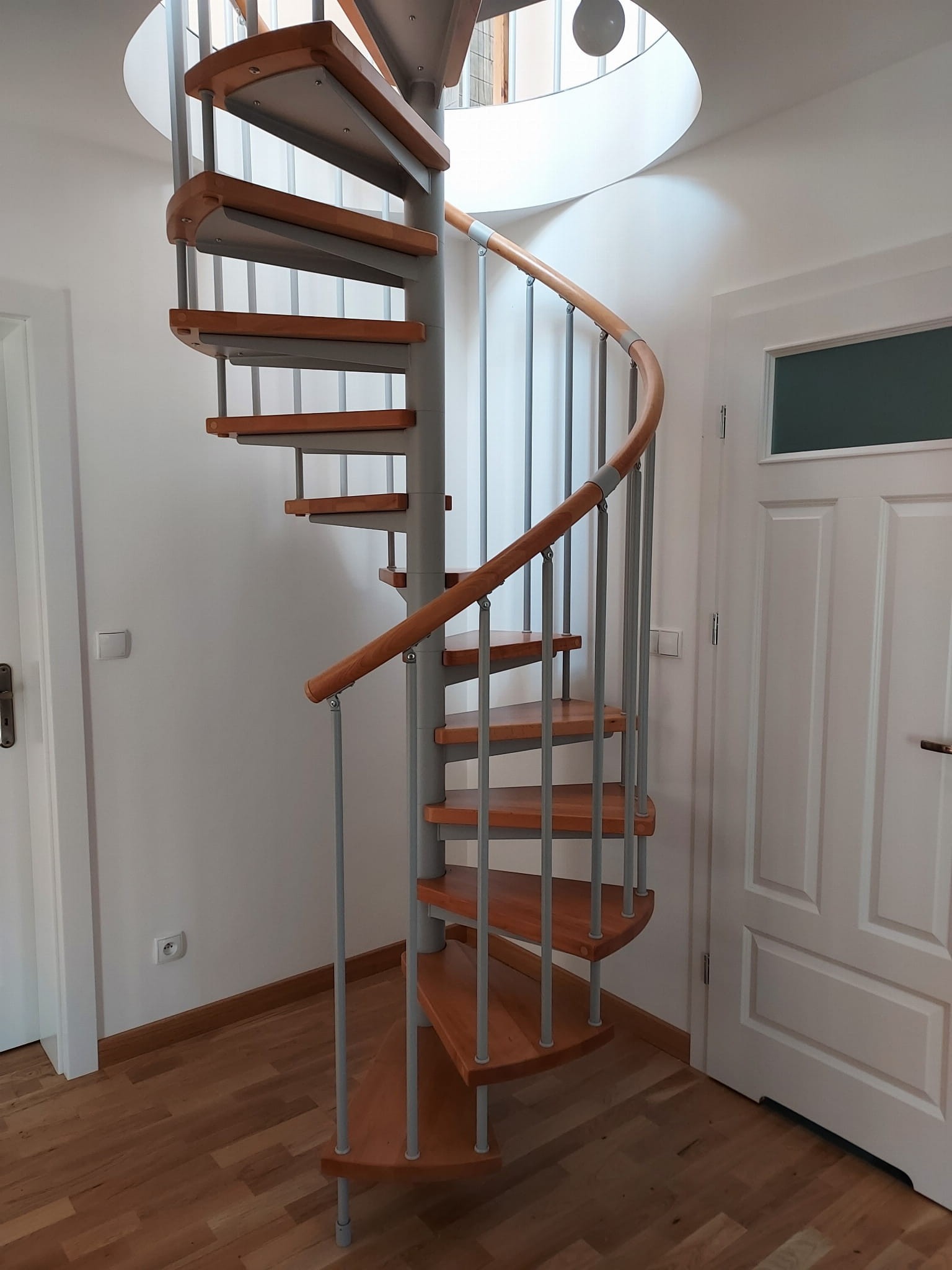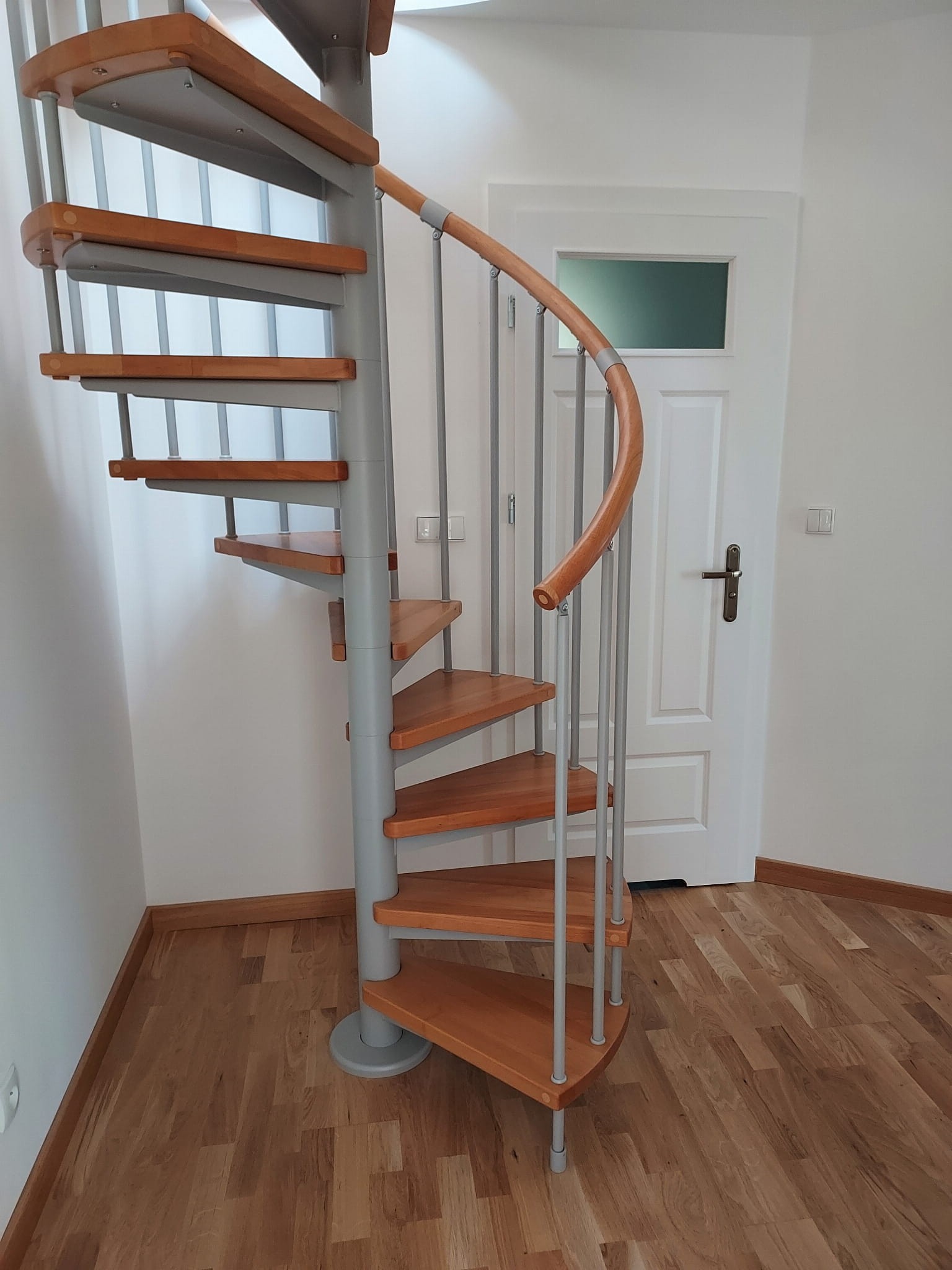 Sada točitých schodů přizpůsobená průměru otvoru ve stropě 210 cm. Prvky jsou vyrobeny z masivního dřeva (barva na výběr z barevné palety výrobce) a práškově lakované oceli v stříbrná matná struktuře. Můžete si je sestavit sami, ale výrobce poskytuje za příplatek i službu montáže.