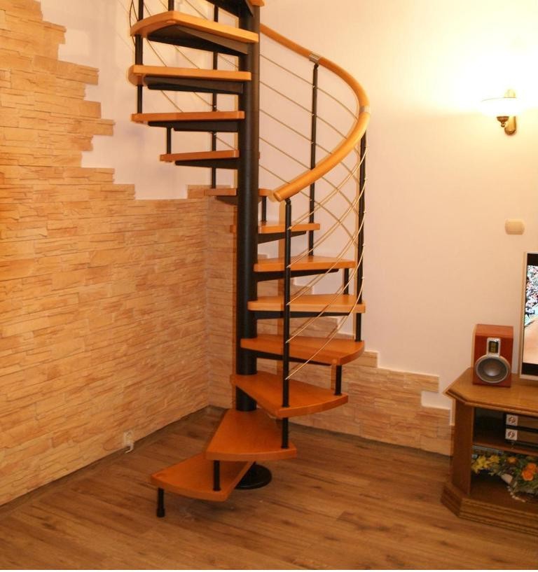 Sada točitých schodů přizpůsobená průměru otvoru ve stropě 150 cm. Prvky jsou vyrobeny z masivního dřeva (barva na výběr z barevné palety výrobce) a práškově lakované oceli v černé matné struktuře. Můžete si je sestavit sami, ale výrobce poskytuje za příplatek i službu montáže.