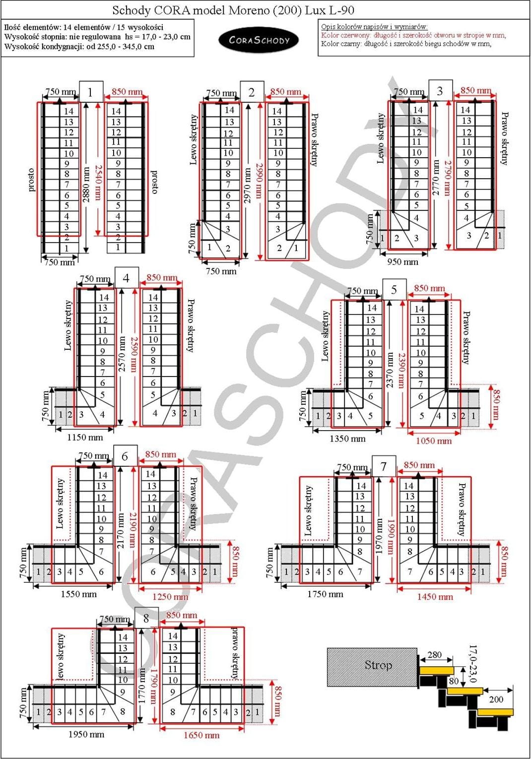 Schody Moreno 200 lux lze instalovat do jednoho z 28 systémů prezentovaných výrobcem. Úprava schodiště je v původním torzním tvaru L-90, vlevo nebo vpravo, stejně jako neobvyklý rovný postup - v tomto případě je třeba do formuláře přidat příslušnou anotaci.
