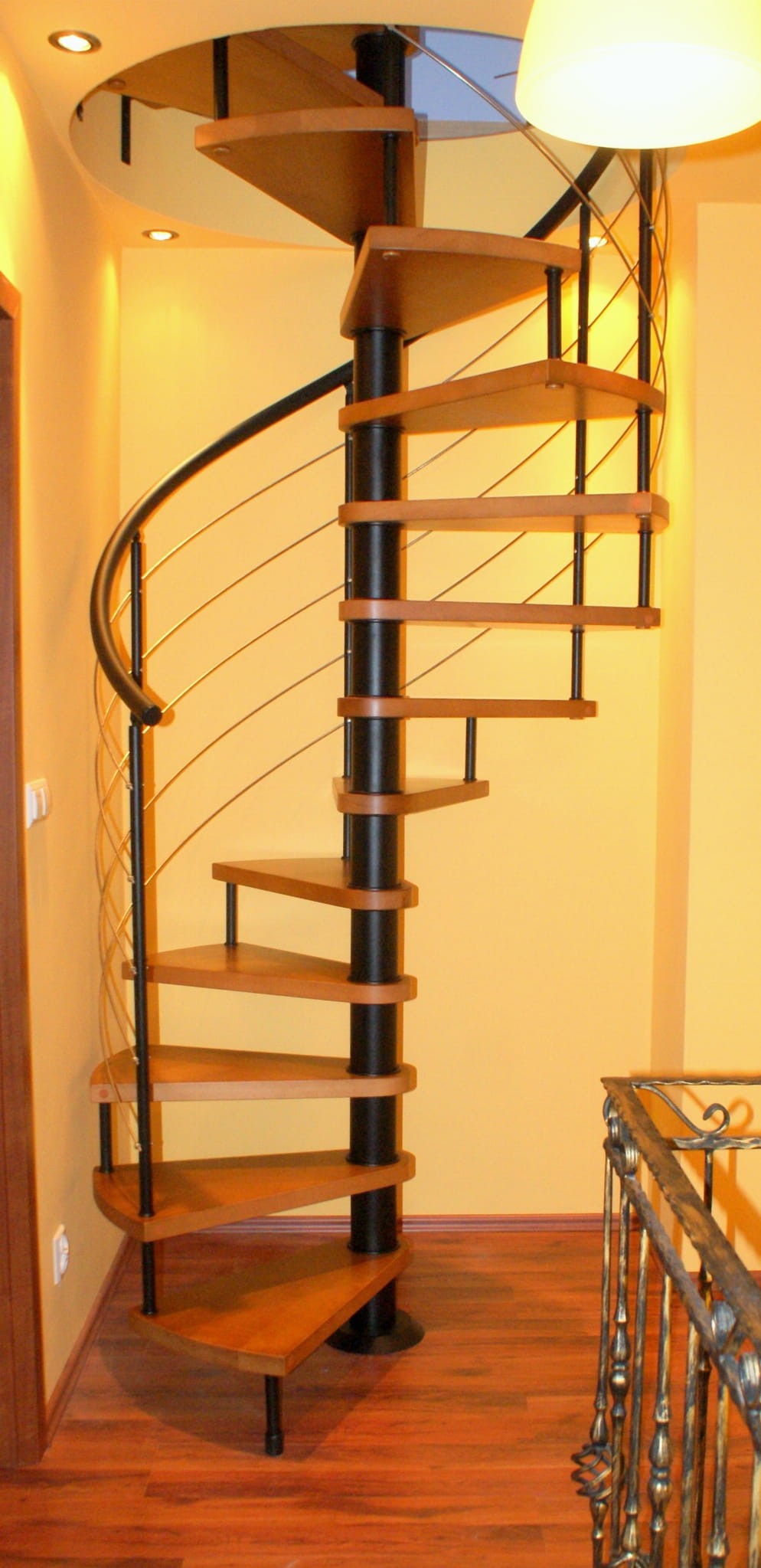 Die angebotenen Wendeltreppen passen in zwei Arten von Öffnungen in der Decke und haben abhängig davon unterschiedliche Podeste. Dreieckige Podeste passen in runde Öffnungen. Dreieckige und trapezförmige Plattformen sind auf quadratische Öffnungen abgestimmt. Die Treppe in diesem Modell hat eine rechte und linke Behandlung. Je nach Konzept sind sie universell montierbar.
