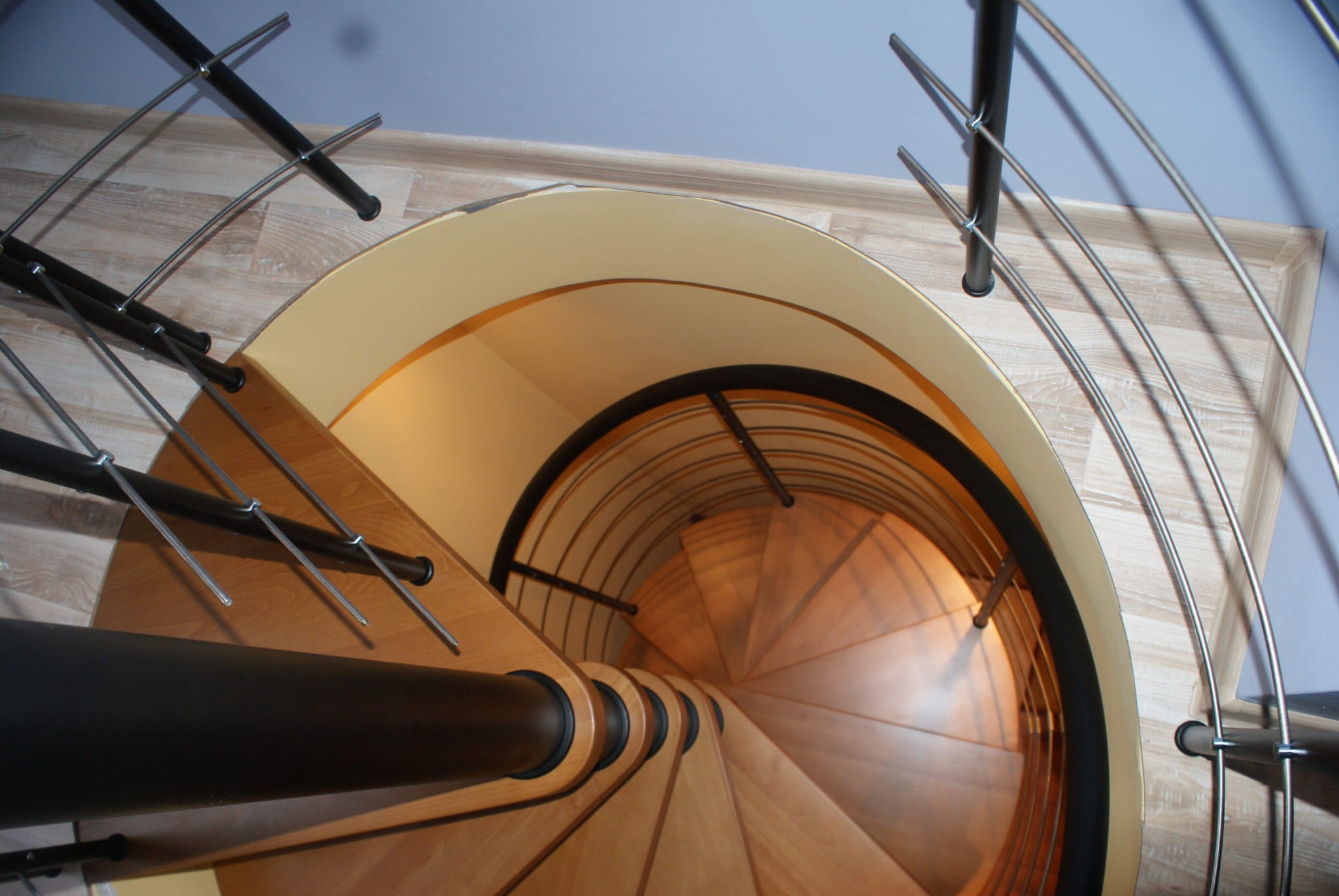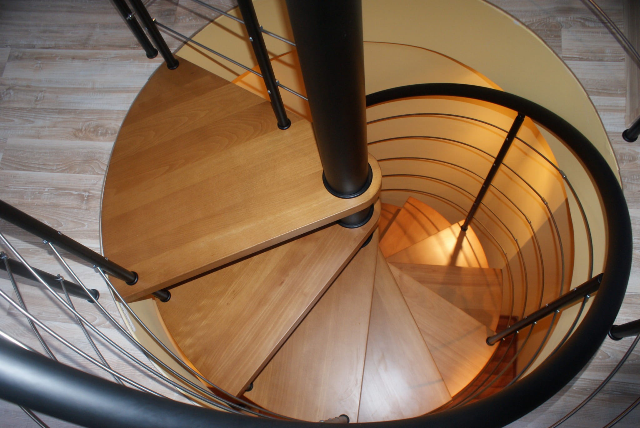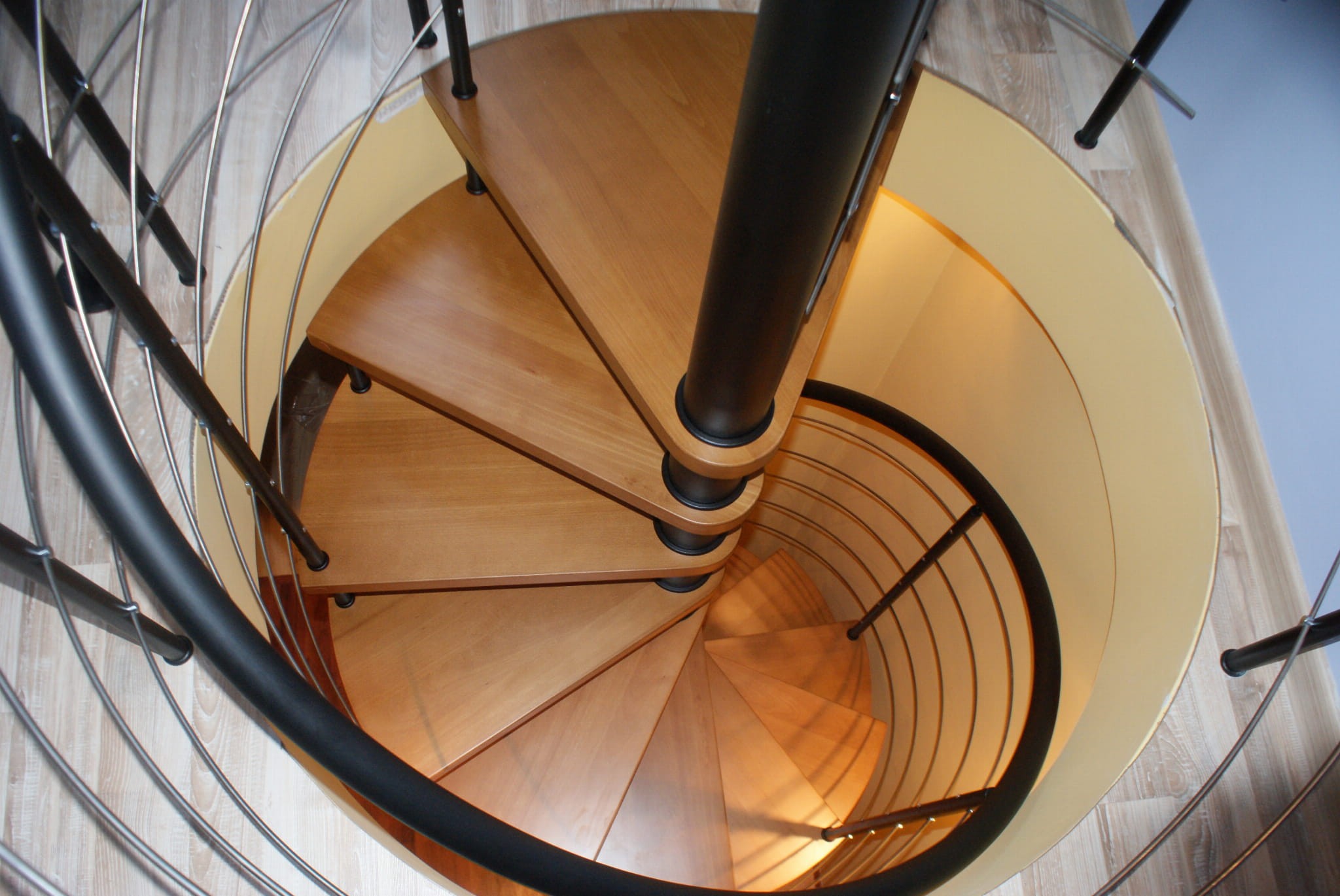 Eine Reihe von Wendeltreppen, die an den Durchmesser der Deckenöffnung von 140 cm angepasst sind. Die Elemente bestehen aus Massivholz (Farbe nach Wahl aus der Farbpalette des Herstellers) und pulverbeschichtetem Stahl in Schwarz-Matt-Struktur. Sie können sie selbst montieren, der Hersteller bietet aber auch einen Montageservice gegen Aufpreis an.