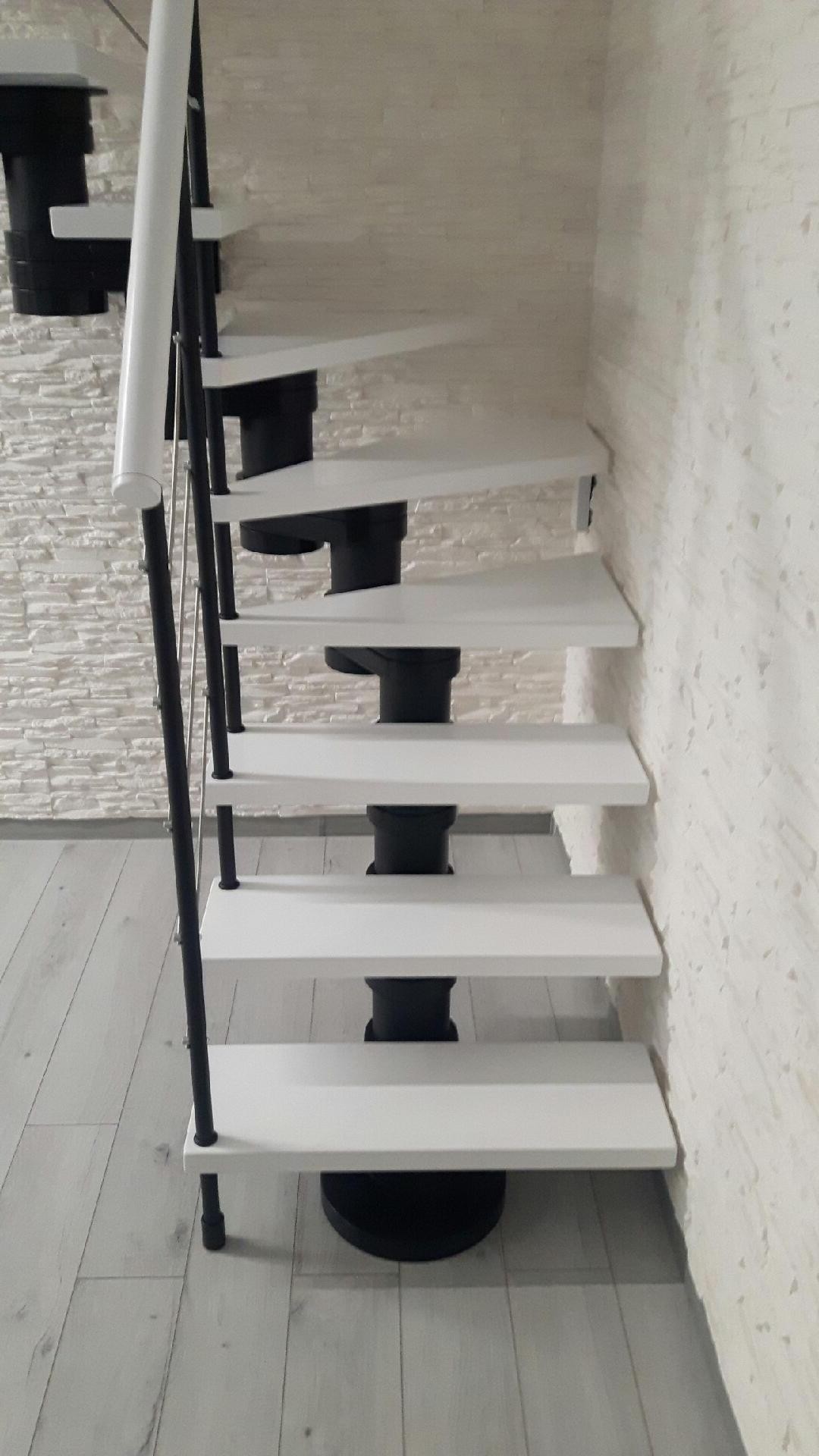 Das Set umfasst 12 Treppenelemente, gefaltet in 13 Ebenen. Die Elemente bestehen überwiegend aus Massivholz (Farbe zur Auswahl aus der Farbpalette des Herstellers) und pulverbeschichtetem Stahl in Schwarz-Matt-Struktur. Nach Bestellung des Service gegen Aufpreis erfolgt die fachgerechte Installation vor Ort durch den Hersteller.