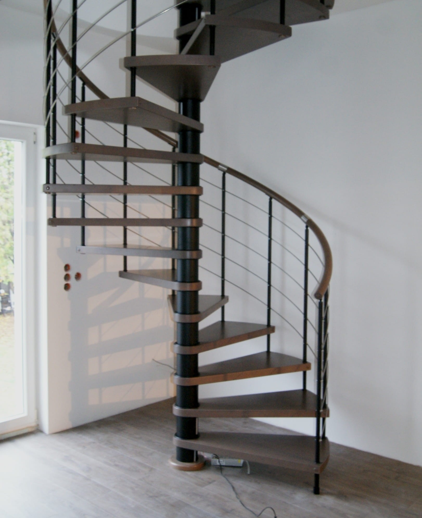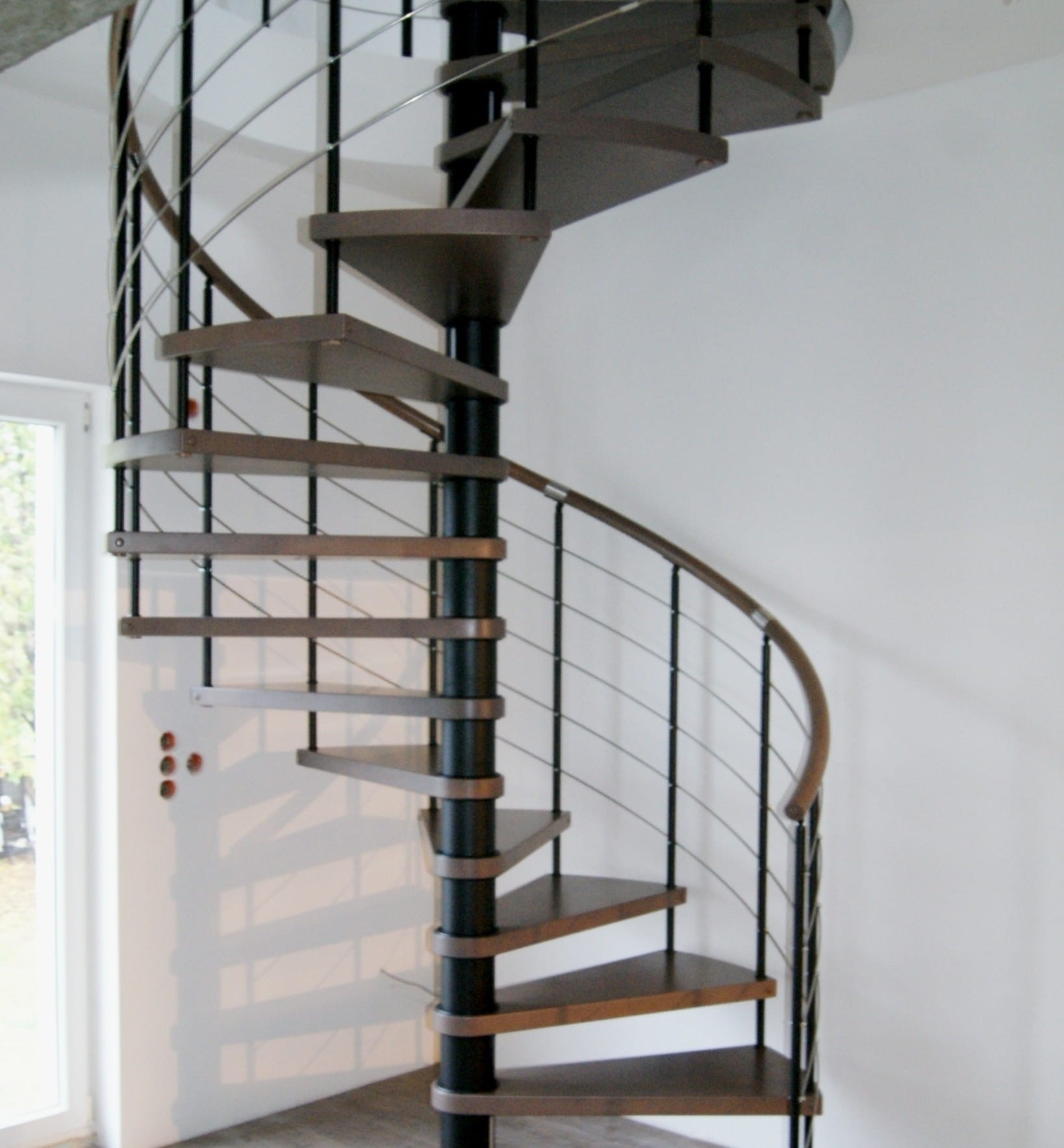 Eine Reihe von Wendeltreppen, die an den Durchmesser der Deckenöffnung von 210 cm angepasst sind. Die Elemente bestehen aus Massivholz (Farbe nach Wahl aus der Farbpalette des Herstellers) und pulverbeschichtetem Stahl in Schwarz-Matt-Struktur. Sie können sie selbst montieren, der Hersteller bietet aber auch einen Montageservice gegen Aufpreis an.