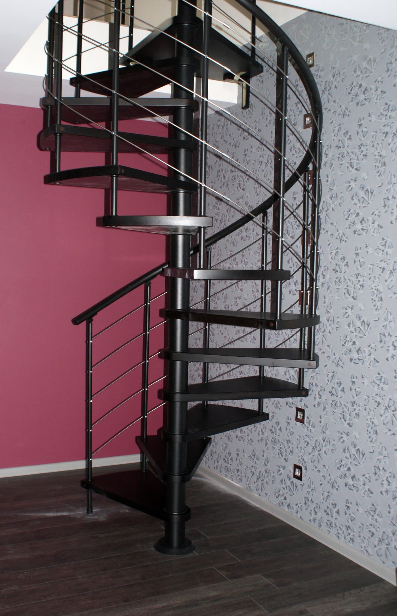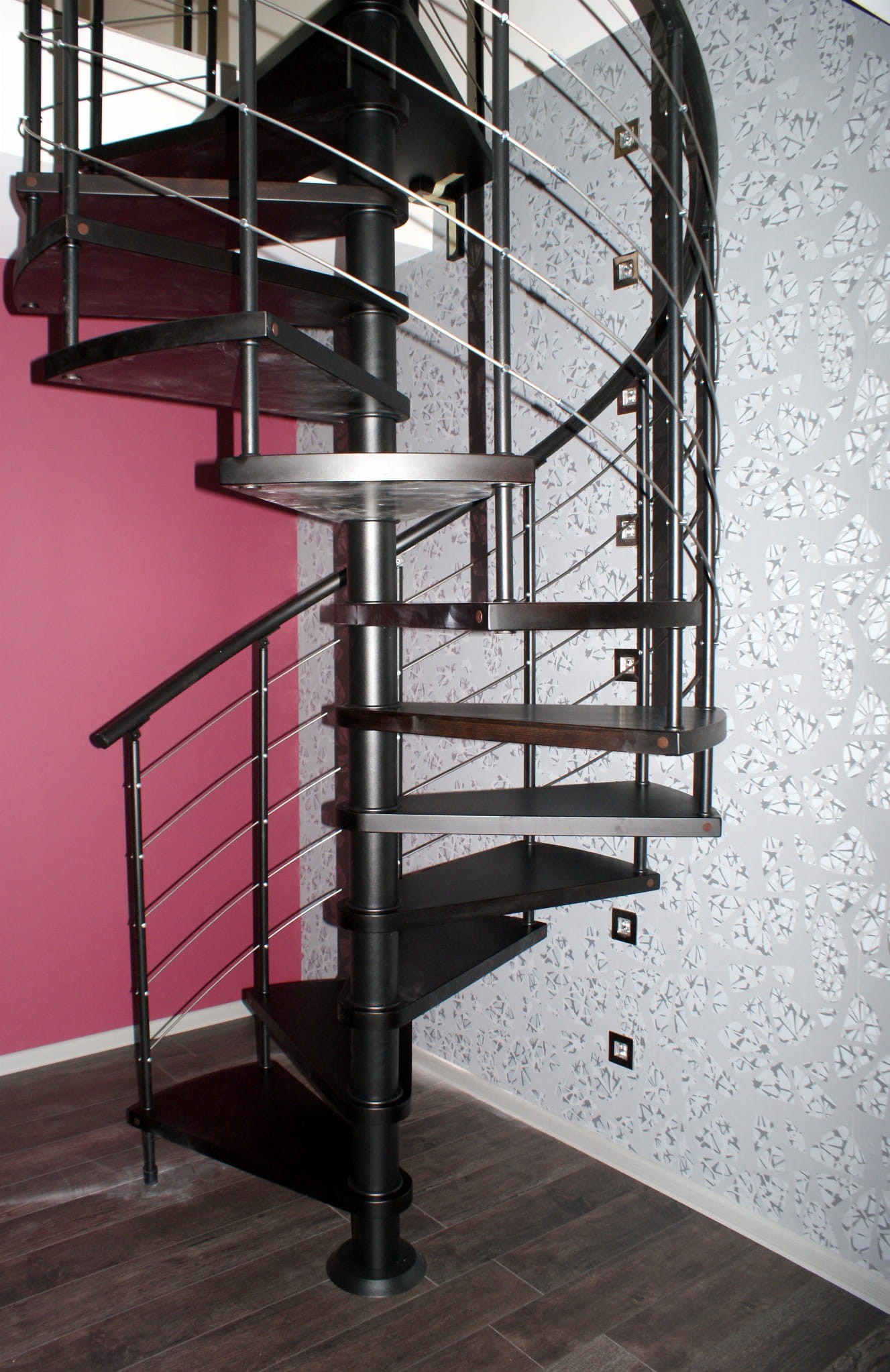 Eine Reihe von Wendeltreppen, die an den Durchmesser der Deckenöffnung von 120 cm angepasst sind. Die Elemente bestehen aus Massivholz (Farbe nach Wahl aus der Farbpalette des Herstellers) und pulverbeschichtetem Stahl in Schwarz-Matt-Struktur. Sie können sie selbst montieren, der Hersteller bietet aber auch einen Montageservice gegen Aufpreis an.