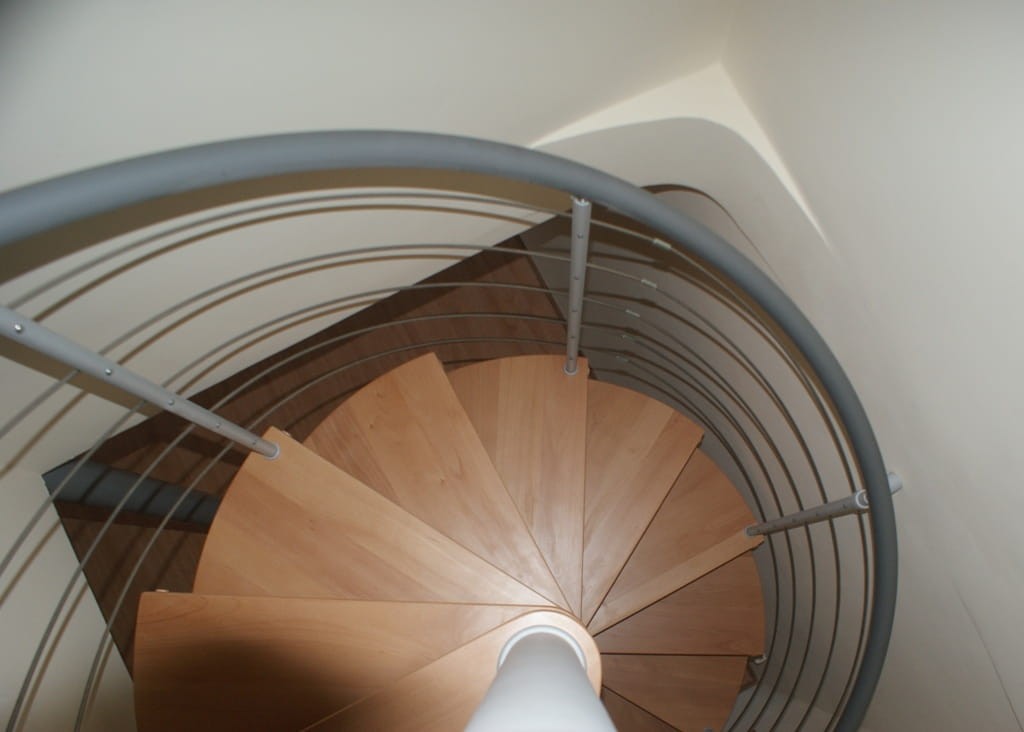 Eine Reihe von Wendeltreppen, die an den Durchmesser der Deckenöffnung von 130 cm angepasst sind. Die Elemente bestehen aus Massivholz (Farbe nach Wahl aus der Farbpalette des Herstellers) und pulverbeschichtetem Stahl in Silber-Matt-Struktur. Sie können sie selbst montieren, der Hersteller bietet aber auch einen Montageservice gegen Aufpreis an.