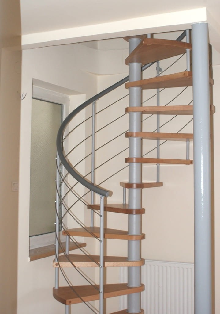 Eine Reihe von Wendeltreppen, die an den Durchmesser der Deckenöffnung von 200 cm angepasst sind. Die Elemente bestehen aus Massivholz (Farbe nach Wahl aus der Farbpalette des Herstellers) und pulverbeschichtetem Stahl in Silber-Matt-Struktur. Sie können sie selbst montieren, der Hersteller bietet aber auch einen Montageservice gegen Aufpreis an.