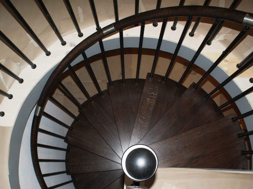 Eine Reihe von Wendeltreppen, die an den Durchmesser der Deckenöffnung von 150 cm angepasst sind. Die Elemente bestehen aus Massivholz (Farbe nach Wahl aus der Farbpalette des Herstellers) und pulverbeschichtetem Stahl in Schwarz-Matt-Struktur. Sie können sie selbst montieren, der Hersteller bietet aber auch einen Montageservice gegen Aufpreis an.