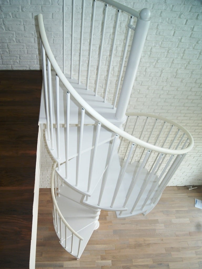 Eine Reihe von Wendeltreppen, die an den Durchmesser der Deckenöffnung von 180 cm angepasst sind. Die Elemente bestehen aus Massivholz (Farbe nach Wahl aus der Farbpalette des Herstellers) und pulverbeschichtetem Stahl in mattweißer Struktur. Sie können sie selbst montieren, der Hersteller bietet aber auch einen Montageservice gegen Aufpreis an.