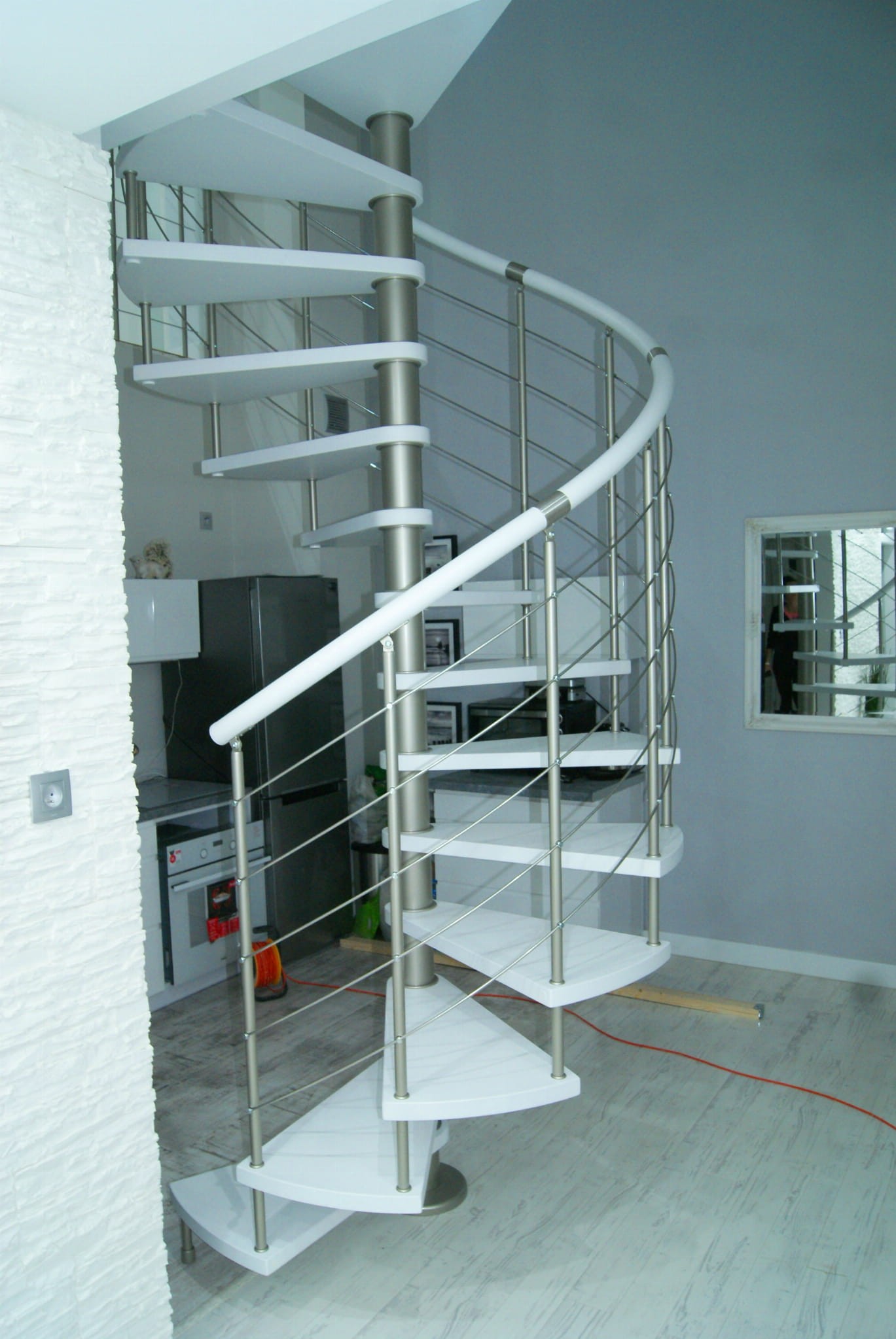 Eine Reihe von Wendeltreppen, die an den Durchmesser der Deckenöffnung von 130 cm angepasst sind. Die Elemente bestehen aus Massivholz (Farbe nach Wahl aus der Farbpalette des Herstellers) und pulverbeschichtetem Stahl in Satin Steel. Sie können sie selbst montieren, der Hersteller bietet aber auch einen Montageservice gegen Aufpreis an.