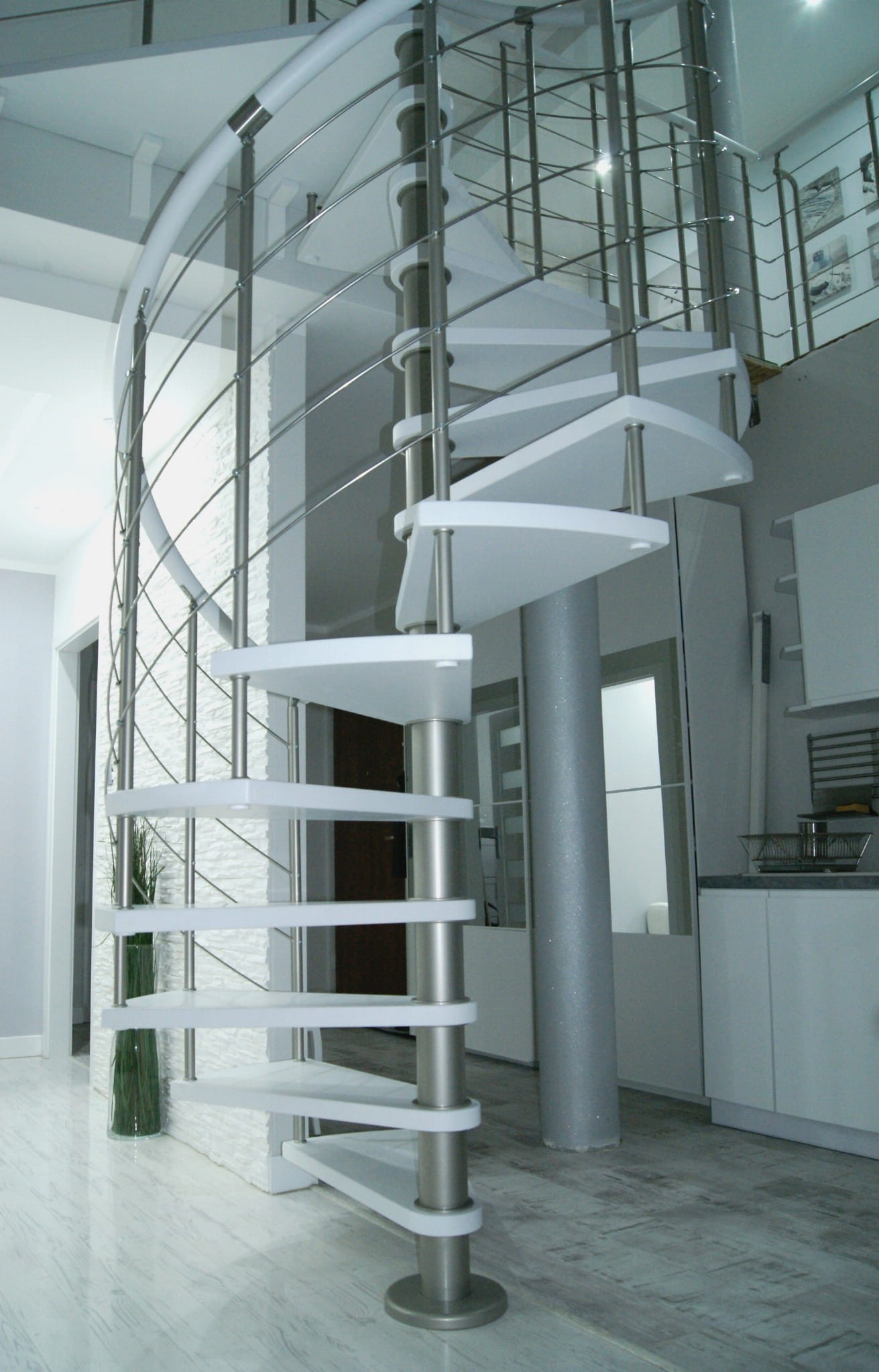 Die angebotenen Wendeltreppen passen in zwei Arten von Öffnungen in der Decke und haben abhängig davon unterschiedliche Podeste. Dreieckige Podeste passen in runde Öffnungen. Dreieckige und trapezförmige Plattformen sind auf quadratische Öffnungen abgestimmt. Die Treppe in diesem Modell hat eine rechte und linke Behandlung. Je nach Konzept sind sie universell montierbar.