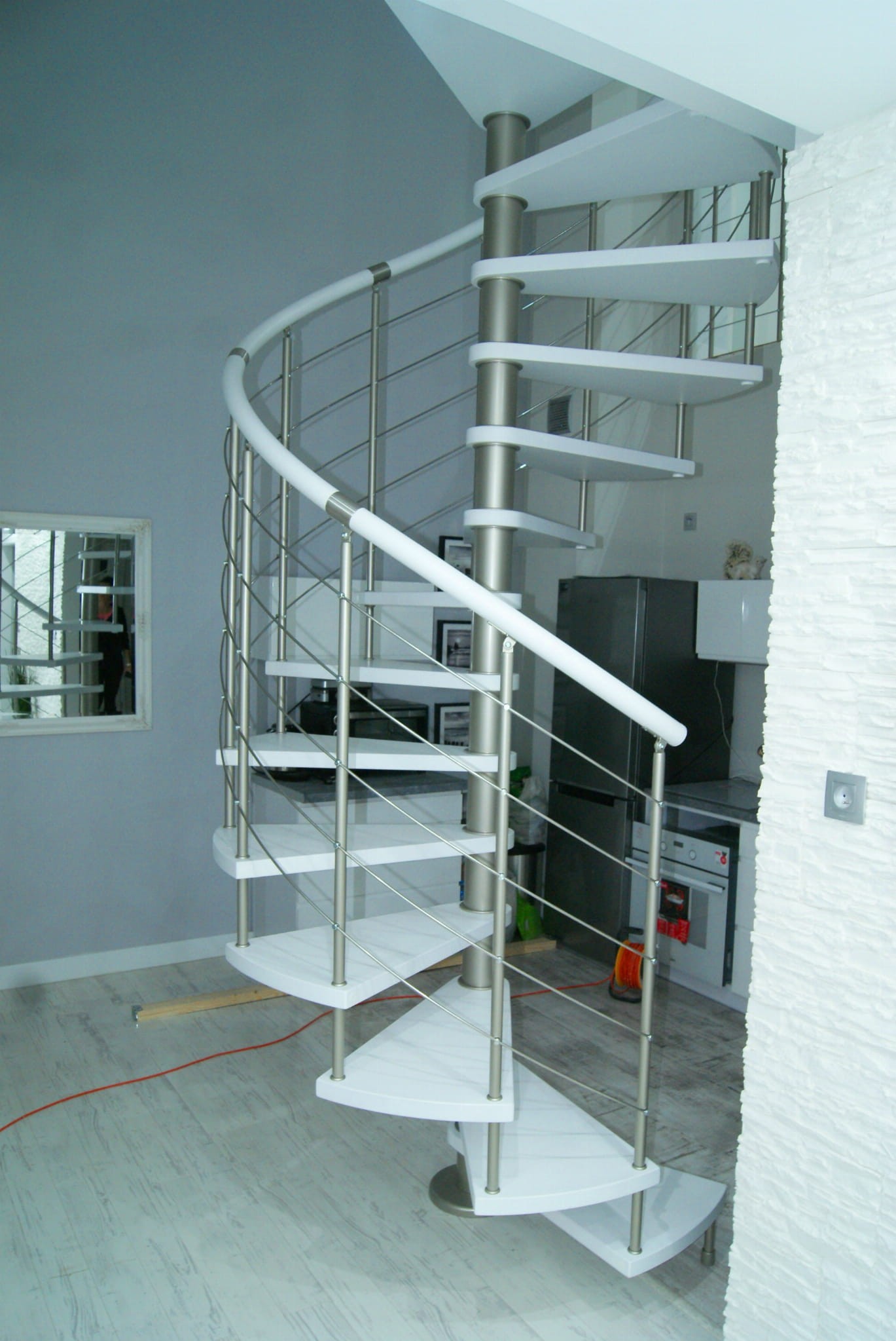 Eine Reihe von Wendeltreppen, die an den Durchmesser der Deckenöffnung von 180 cm angepasst sind. Die Elemente bestehen aus Massivholz (Farbe nach Wahl aus der Farbpalette des Herstellers) und pulverbeschichtetem Stahl in Satin Steel. Sie können sie selbst montieren, der Hersteller bietet aber auch einen Montageservice gegen Aufpreis an.