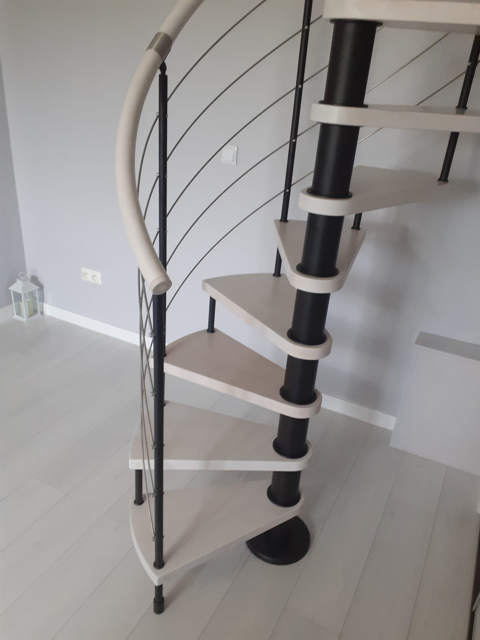 Eine Reihe von Wendeltreppen, die an den Durchmesser der Deckenöffnung von 160 cm angepasst sind. Die Elemente bestehen aus Massivholz (Farbe nach Wahl aus der Farbpalette des Herstellers) und pulverbeschichtetem Stahl in Schwarz-Matt-Struktur. Sie können sie selbst montieren, der Hersteller bietet aber auch einen Montageservice gegen Aufpreis an.