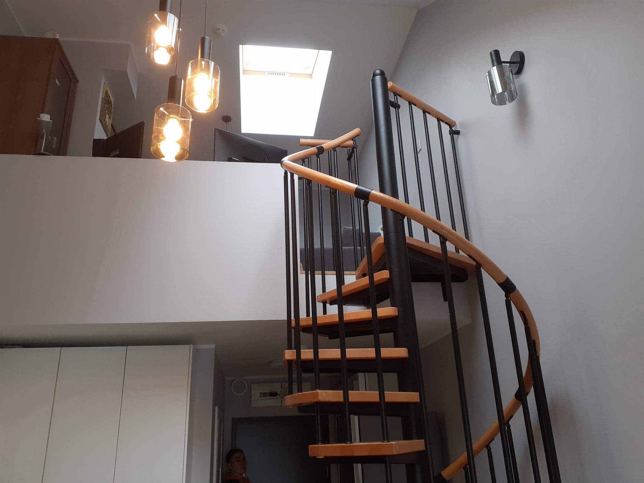 Eine Reihe von Wendeltreppen, die an den Durchmesser der Deckenöffnung von 140 cm angepasst sind. Die Elemente bestehen aus Massivholz (Farbe nach Wahl aus der Farbpalette des Herstellers) und pulverbeschichtetem Stahl in Schwarz-Matt-Struktur. Sie können sie selbst montieren, der Hersteller bietet aber auch einen Montageservice gegen Aufpreis an.