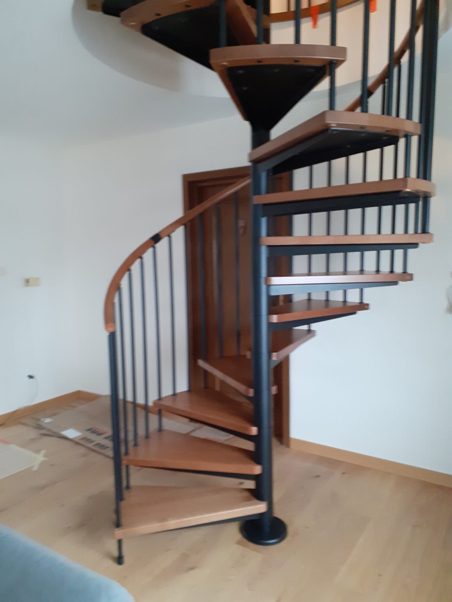Eine Reihe von Wendeltreppen, die an den Durchmesser der Deckenöffnung von 160 cm angepasst sind. Die Elemente bestehen aus Massivholz (Farbe nach Wahl aus der Farbpalette des Herstellers) und pulverbeschichtetem Stahl in Schwarz-Matt-Struktur. Sie können sie selbst montieren, der Hersteller bietet aber auch einen Montageservice gegen Aufpreis an.