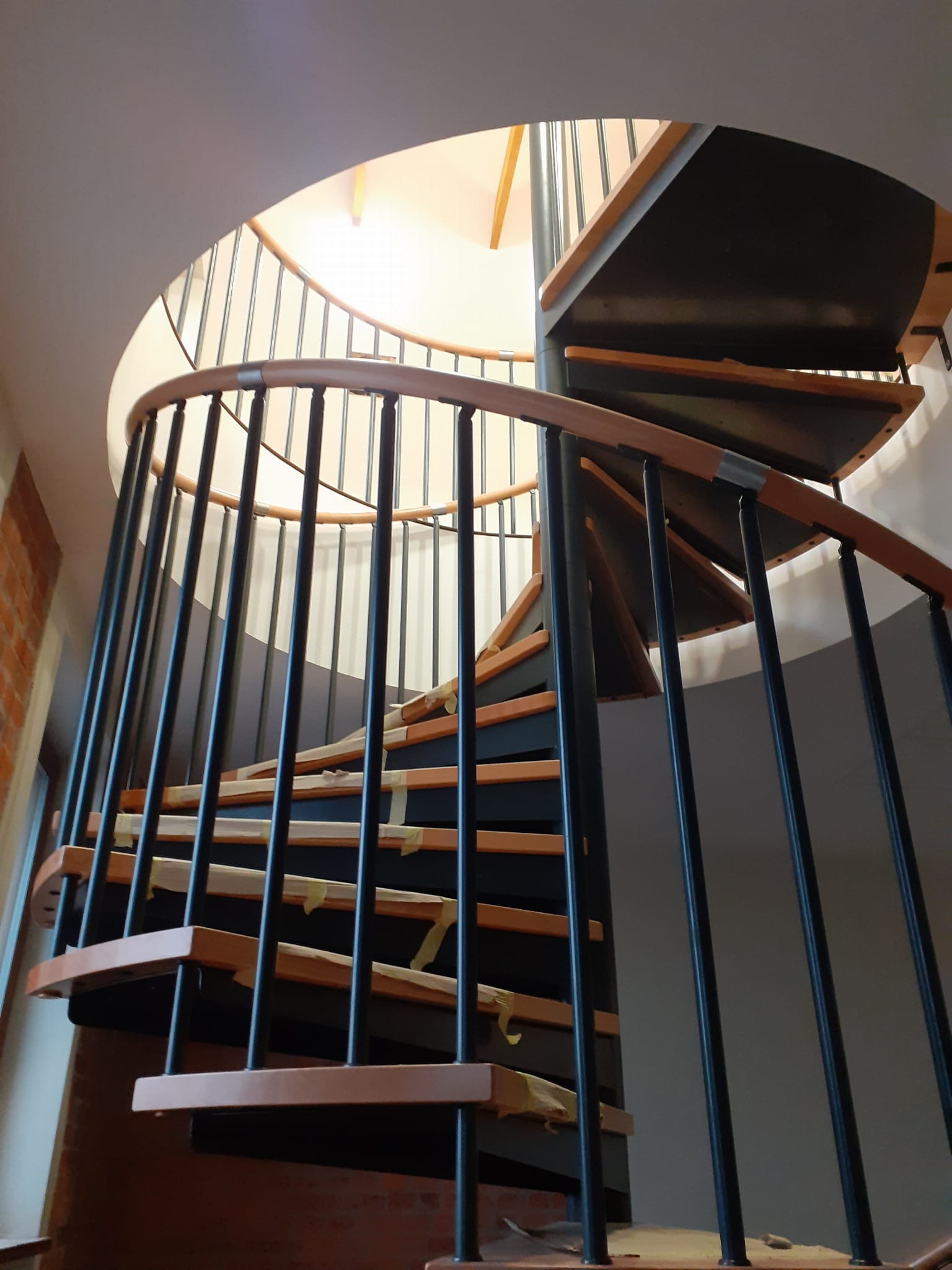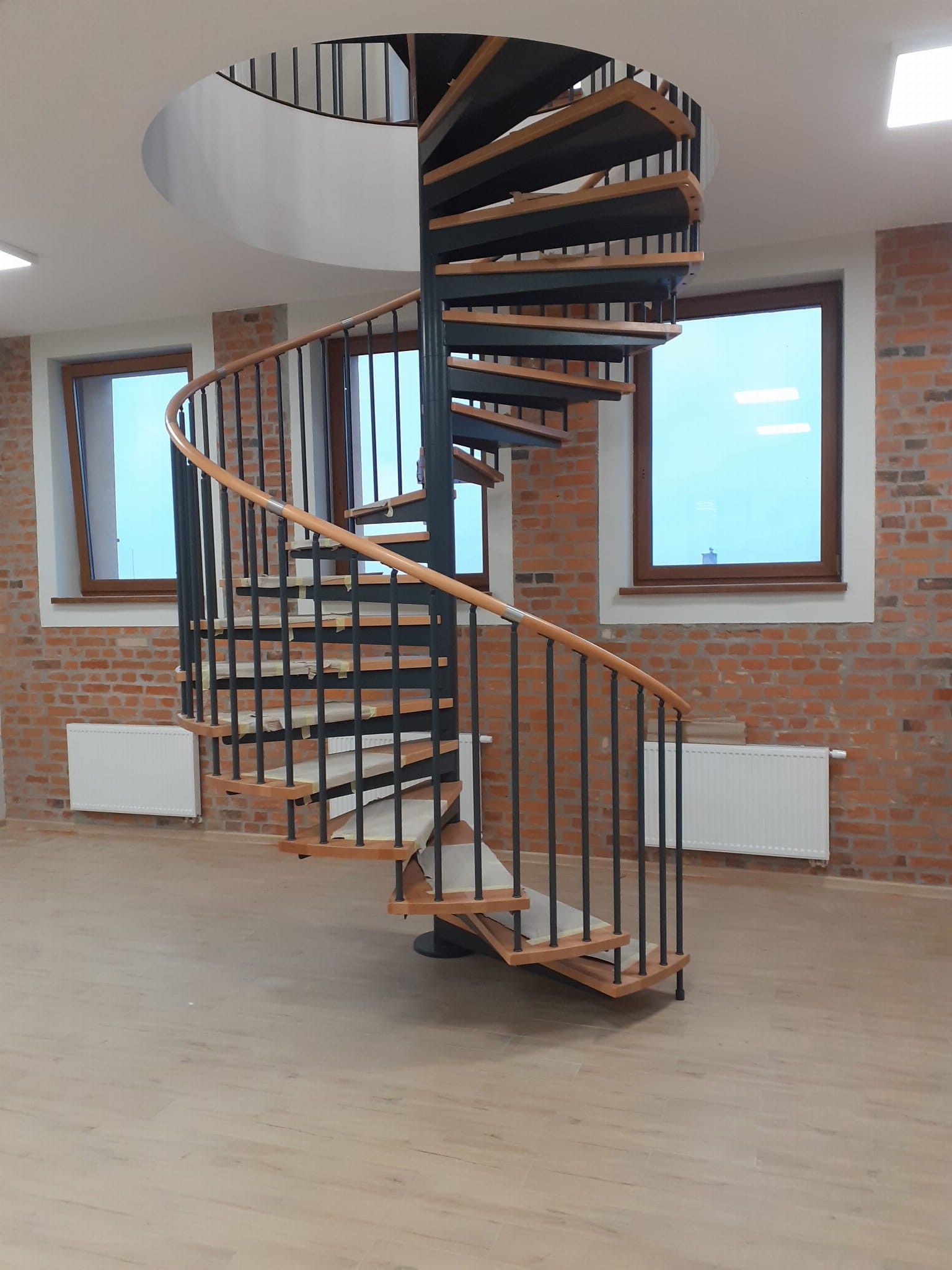 Eine Reihe von Wendeltreppen, die an den Durchmesser der Deckenöffnung von 180 cm angepasst sind. Die Elemente bestehen aus Massivholz (Farbe nach Wahl aus der Farbpalette des Herstellers) und pulverbeschichtetem Stahl in Schwarz-Matt-Struktur. Sie können sie selbst montieren, der Hersteller bietet aber auch einen Montageservice gegen Aufpreis an.