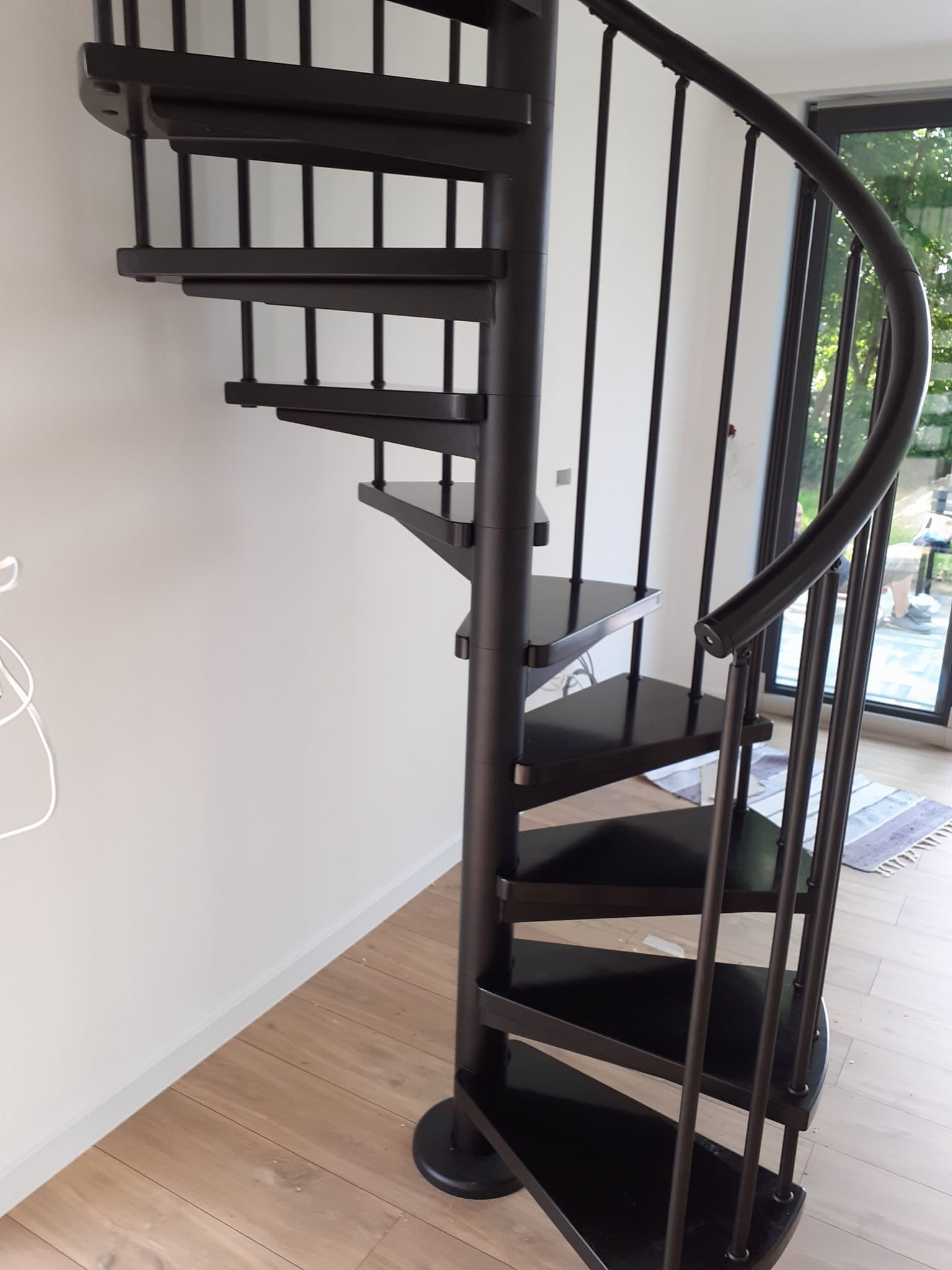 Eine Wendeltreppe, angepasst an den Durchmesser der Deckenöffnung von 190 cm. Die Elemente bestehen aus Massivholz (Farbe zur Auswahl aus der Farbpalette des Herstellers) und pulverbeschichtetem Stahl in mattschwarzer Struktur. Sie können sie selbst zusammenbauen, der Hersteller bietet jedoch gegen Aufpreis auch einen Montageservice an.