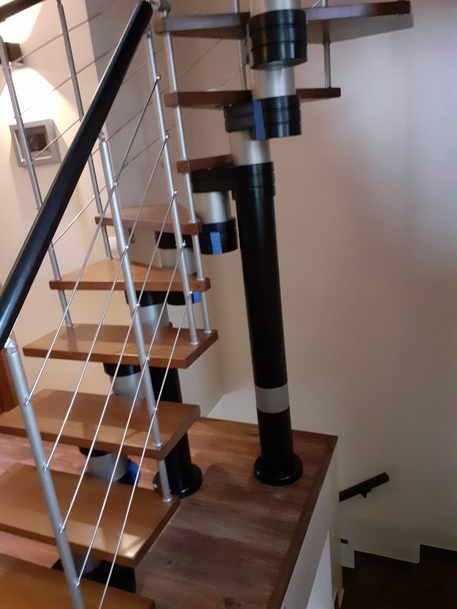 Es wird empfohlen, die Treppe bis zu 5 cm von der Wand entfernt zu installieren, was die Installation von Ankern ermöglicht. Wenn die Wand der Verankerung nicht standhalten kann, muss stattdessen eine Stützsäule installiert werden. Bei freistehenden Treppen ist der Einsatz einer Stützsäule sowie einer beidseitig schützenden Balustrade vorgesehen, weitere Optionen auf Anfrage.