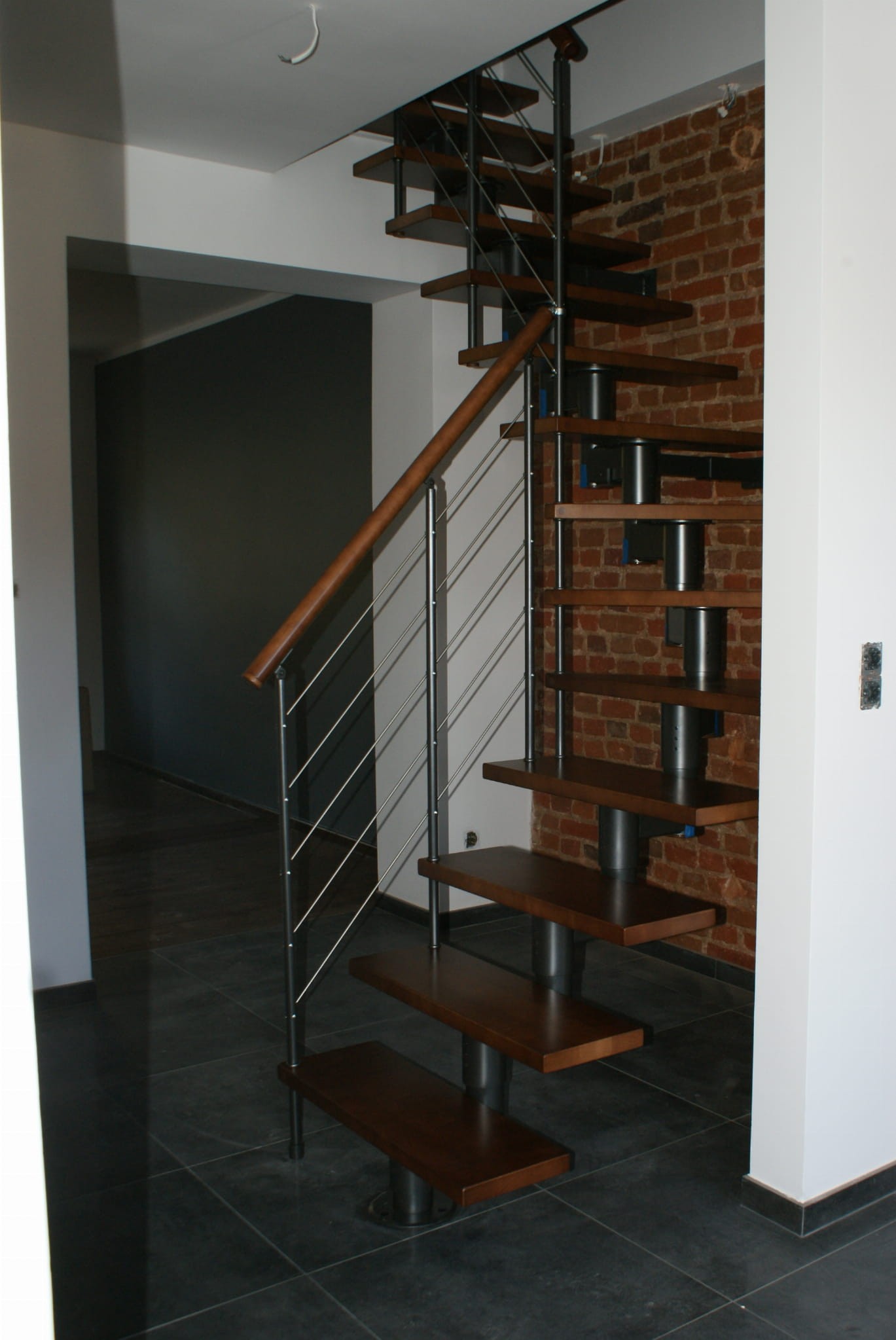 Die Treppe sollte teilweise gegen die Wand laufen. Sie dürfen nicht weiter als 5 cm von der Wand entfernt sein. Es bezieht sich auf die Sicherheit bei der Benutzung der Treppe. Eine Verankerung an der Wand ist unerlässlich.