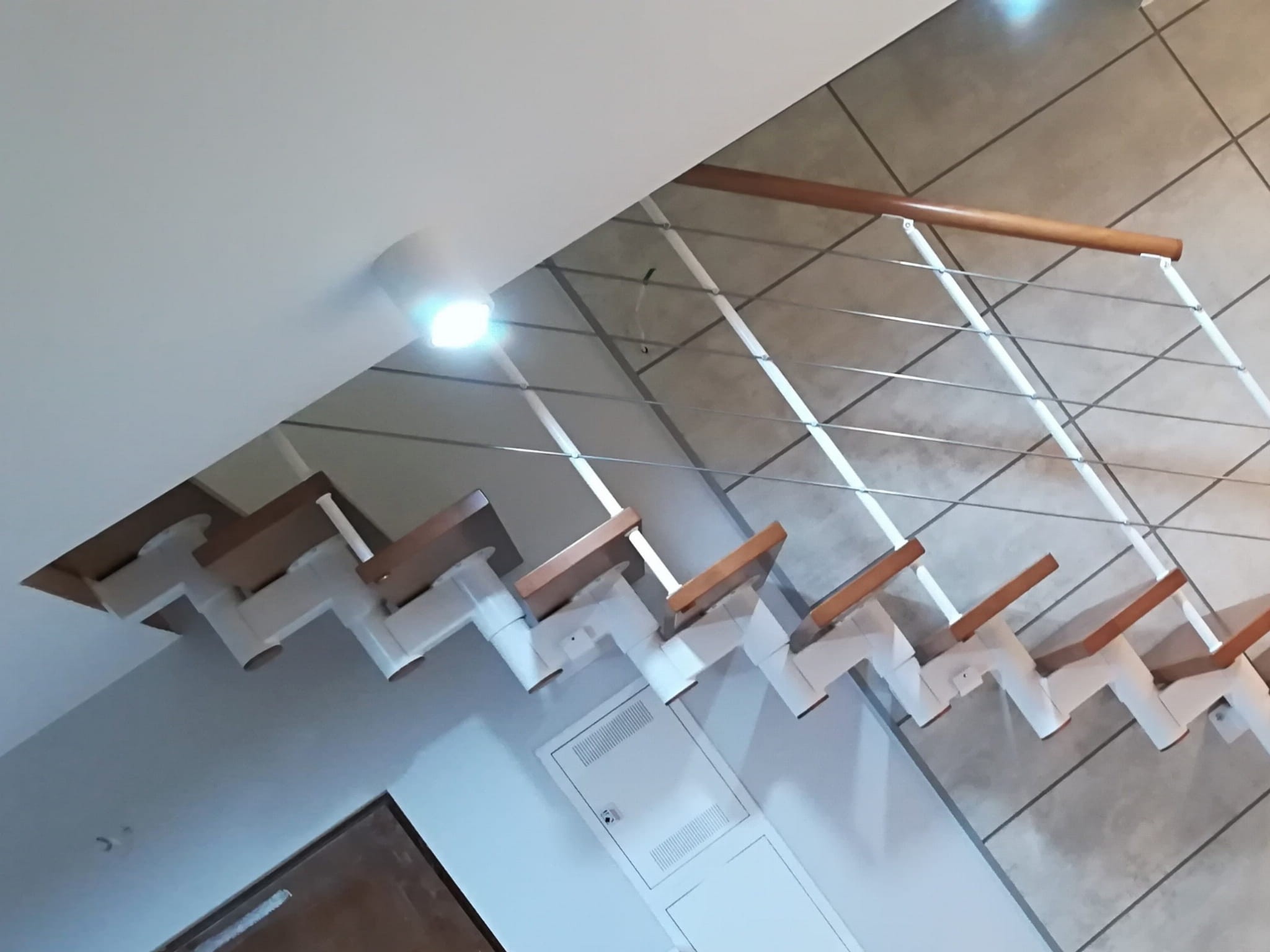 Die Treppe sollte teilweise gegen die Wand laufen. Sie dürfen nicht weiter als 5 cm von der Wand entfernt sein. Es bezieht sich auf die Sicherheit bei der Benutzung der Treppe. Eine Verankerung an der Wand ist unerlässlich.