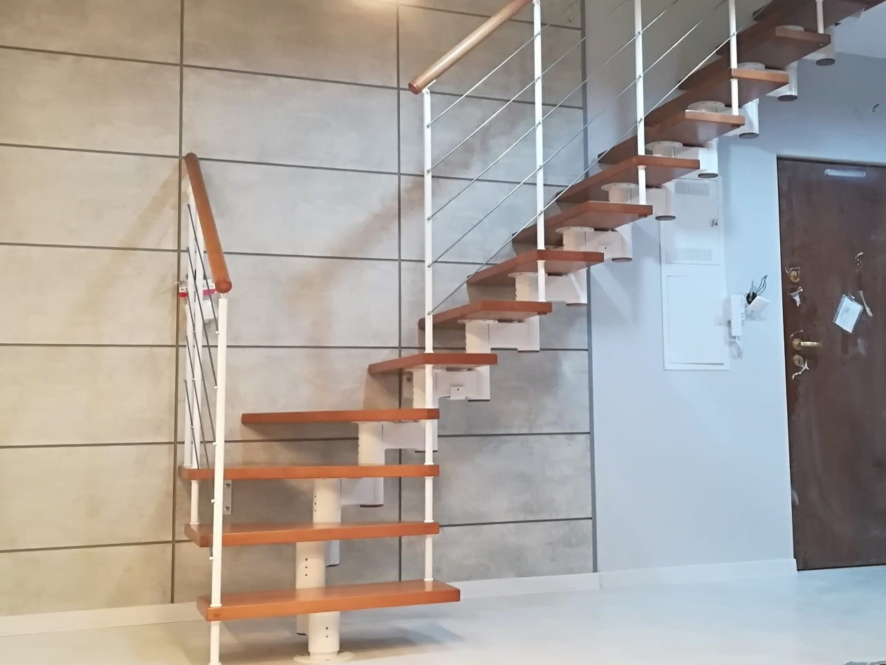 Das Set enthält 13 Treppenelemente, die in 14 Ebenen gefaltet sind. Die Elemente bestehen überwiegend aus Massivholz (Farbe nach Wahl aus der vom Hersteller vorgestellten Farbpalette) und pulverbeschichtetem Stahl in Weiß (RAL 9003). Nach Bestellung des kostenpflichtigen Service erfolgt die fachgerechte Installation im Land durch den Hersteller.