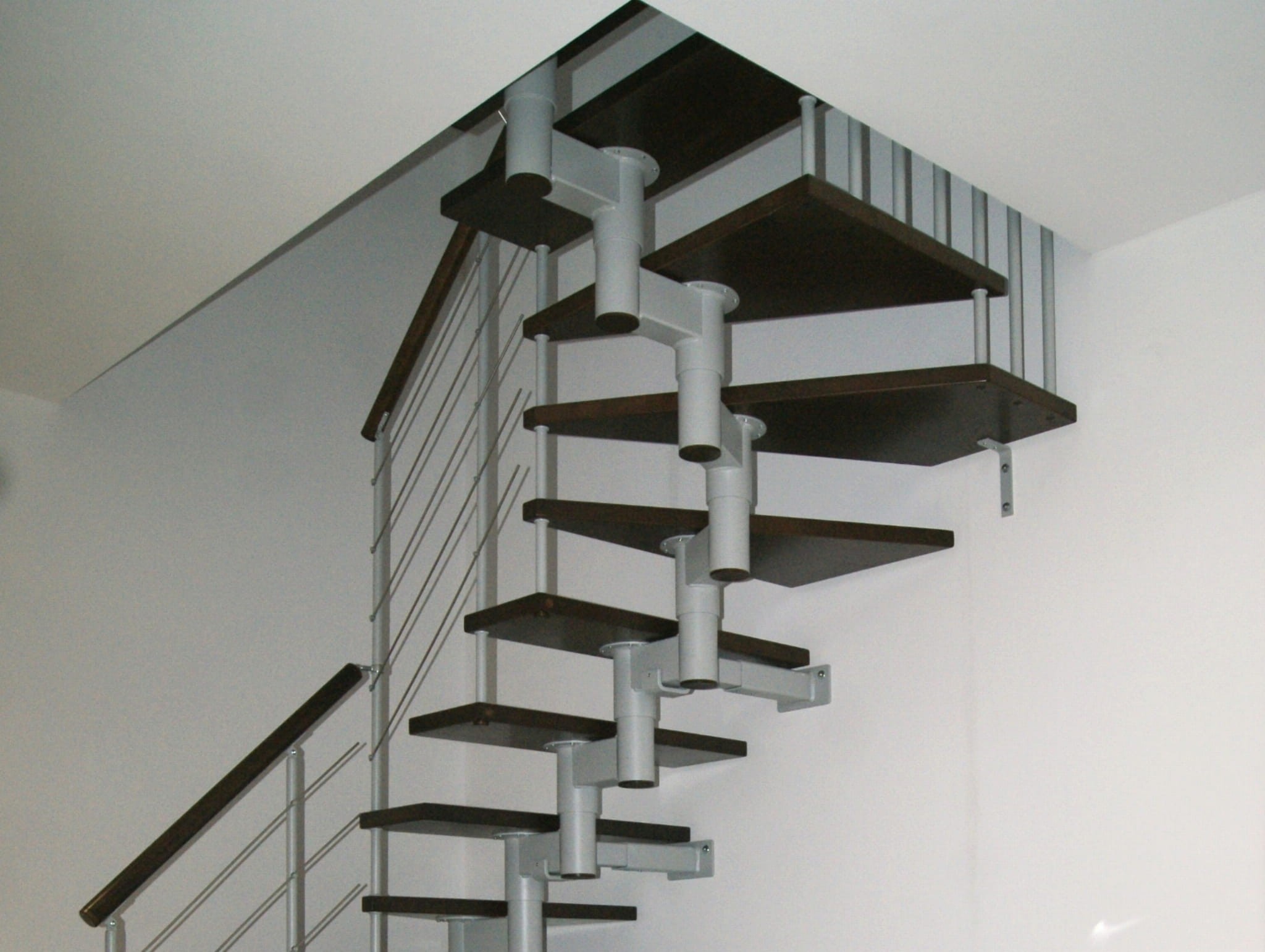 Die Treppe sollte teilweise gegen die Wand laufen. Sie dürfen nicht weiter als 5 cm von der Wand entfernt sein. Es bezieht sich auf die Sicherheit bei der Benutzung der Treppe. Eine Verankerung an der Wand ist unerlässlich.