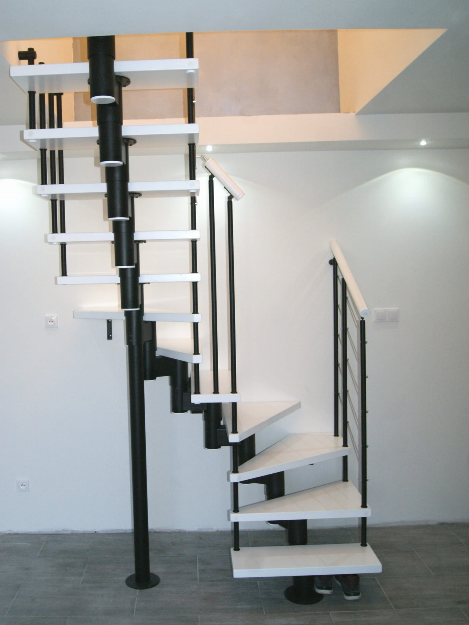 Das Set enthält 12 Treppenelemente, die in 13 Ebenen gefaltet sind. Die Elemente bestehen aus Massivholz (die Farbe kann aus der Farbpalette des Herstellers gewählt werden) und pulverbeschichtetem Stahl in der Farbe schwarz matte Struktur. Nach Bestellung des kostenpflichtigen Service erfolgt die fachgerechte Installation im Land durch den Hersteller.