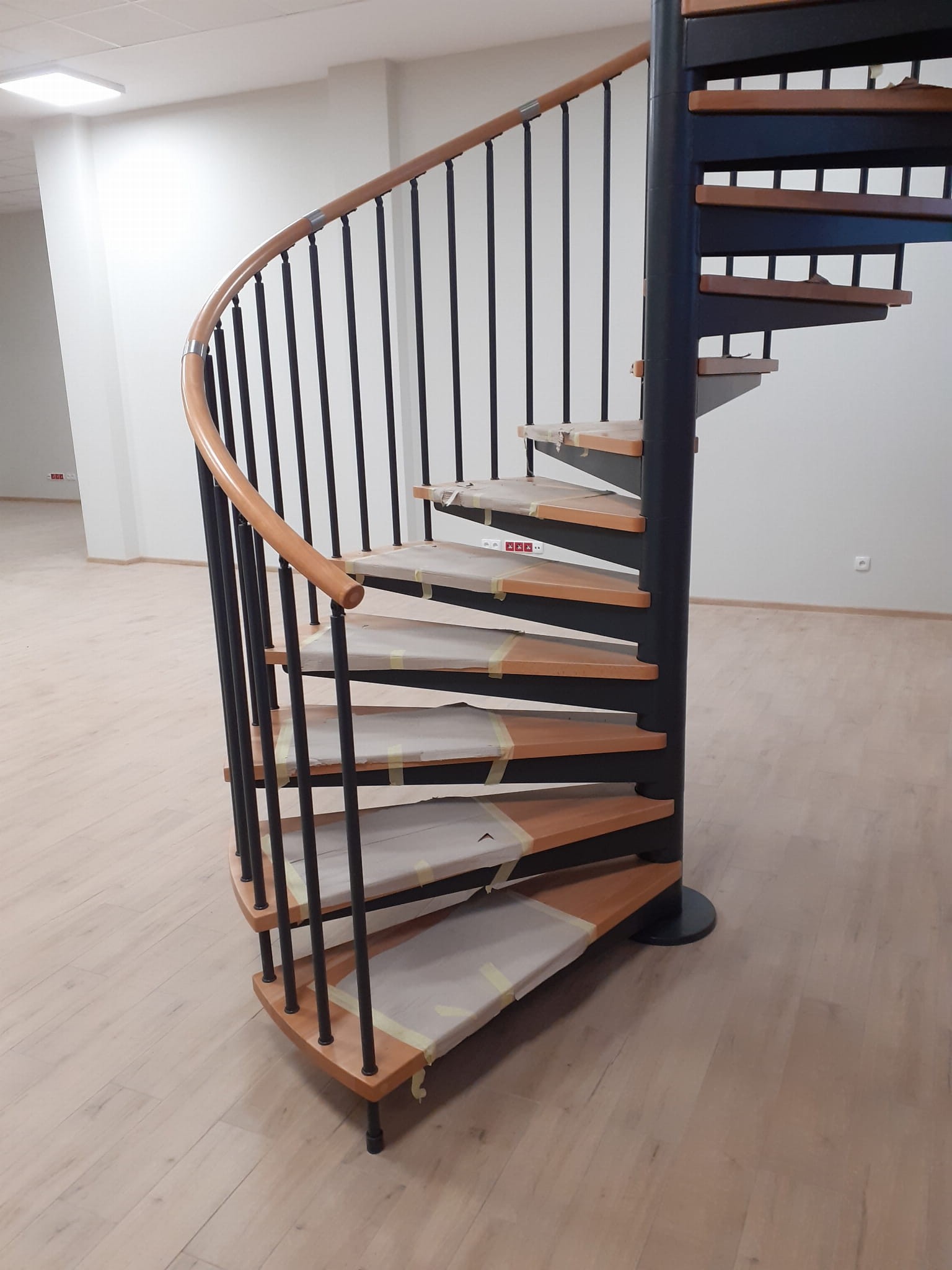 Zestaw schodów spiralnych przystosowanych do średnicy otworu w stropie o wartości 180 cm. Elementy wykonano z litego drewna (kolor do wyboru z palety barw producenta) oraz stali malowanej proszkowo w kolorze czarny mat struktura. Można montować je samodzielnie, lecz producent udostępnia również usługę montażową za dopłatą.