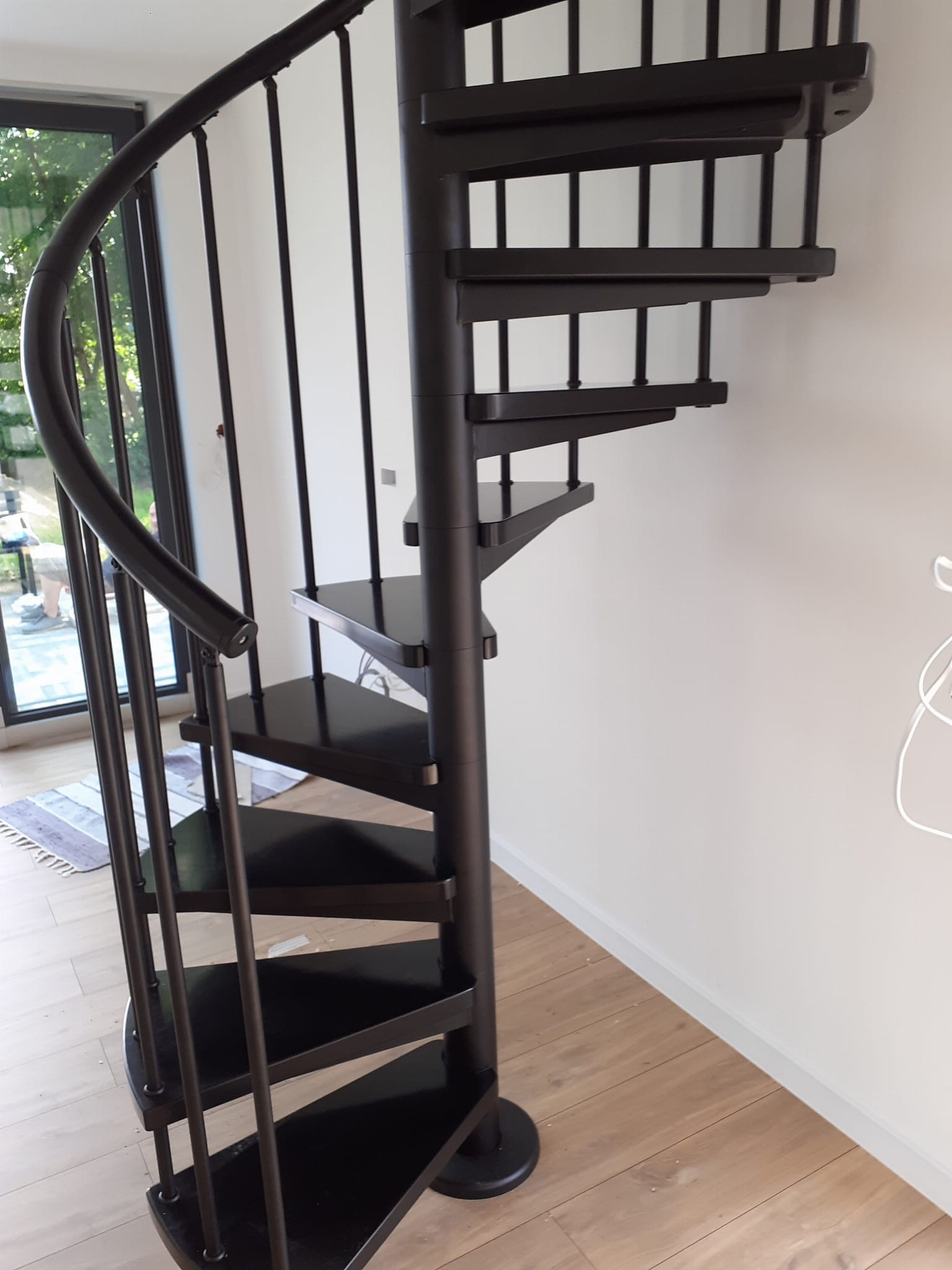 Zestaw schodów spiralnych przystosowanych do średnicy otworu w stropie o wartości 140 cm. Elementy wykonano z litego drewna (kolor do wyboru z palety barw producenta) oraz stali malowanej proszkowo w kolorze czarny mat struktura. Można montować je samodzielnie, lecz producent udostępnia również usługę montażową za dopłatą.
