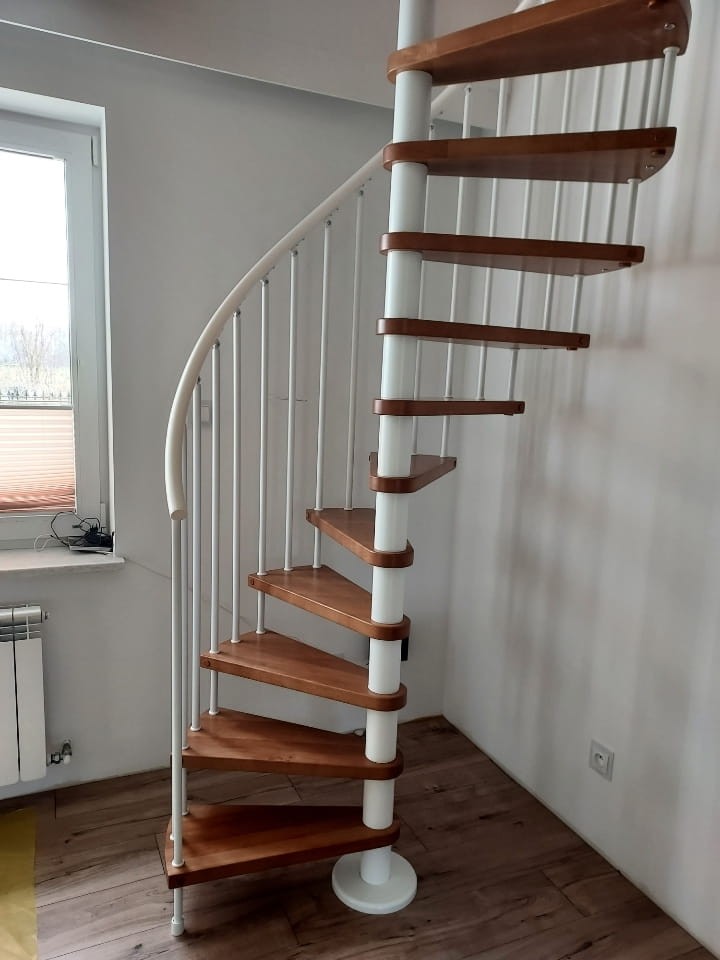 Zestaw schodów spiralnych przystosowanych do średnicy otworu w stropie o wartości 180 cm. Elementy wykonano z litego drewna (kolor do wyboru z palety barw producenta) oraz stali malowanej proszkowo w kolorze biały matowy struktura. Można montować je samodzielnie, lecz producent udostępnia również usługę montażową za dopłatą.