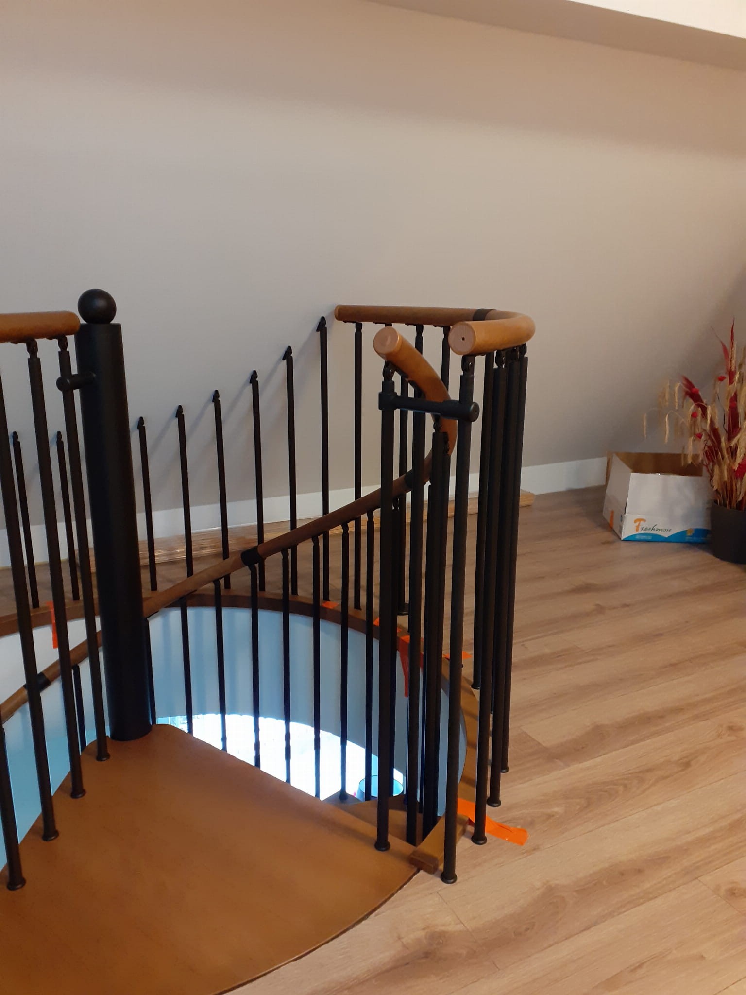 Zestaw schodów spiralnych przystosowanych do średnicy otworu w stropie o wartości 160 cm. Elementy wykonano z litego drewna (kolor do wyboru z palety barw producenta) oraz stali malowanej proszkowo w kolorze czarny mat struktura. Można montować je samodzielnie, lecz producent udostępnia również usługę montażową za dopłatą.