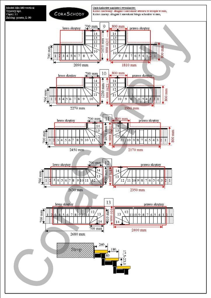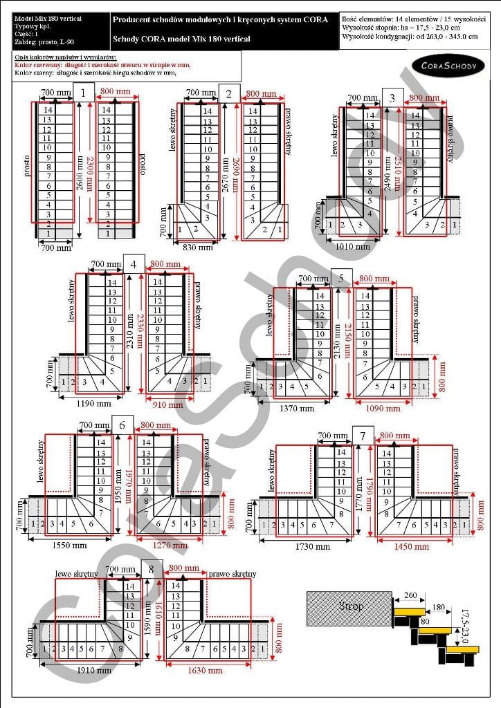 Schody Mix 180 posiada możliwość zamontowania w jednej z 26 układów, które prezentuje producent. Zabieg schodów jest w oryginalnej formie skrętny L-90, w lewo bądź w prawo, jak również nietypowego zabiegu prostego - w tym przypadku należy dodać odpowiednią adnotację do formularza.