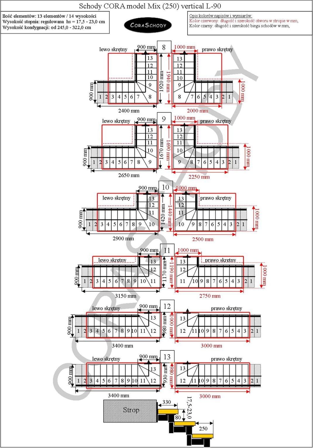 Schody Mix 250 vertical posiada możliwość zamontowania w jednej z 26 układów, które prezentuje producent. Zabieg schodów jest w oryginalnej formie skrętny L-90, w lewo bądź w prawo, jak również nietypowego zabiegu prostego - w tym przypadku należy dodać odpowiednią adnotację do formularza.