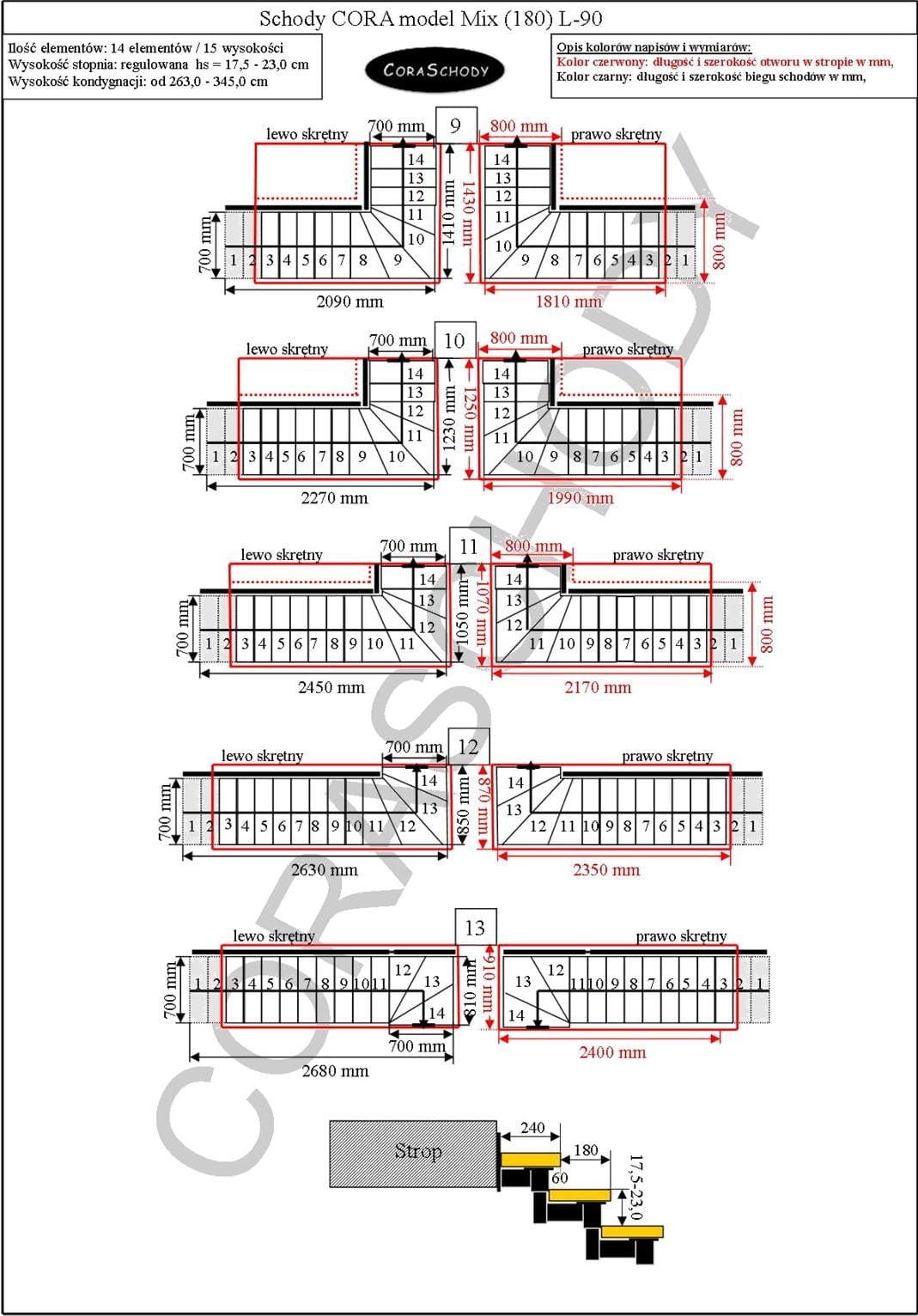 Schody Mix 08 posiada możliwość zamontowania w jednej z 26 układów, które prezentuje producent. Zabieg schodów jest w oryginalnej formie skrętny L-90, w lewo bądź w prawo, jak również nietypowego zabiegu prostego - w tym przypadku należy dodać odpowiednią adnotację do formularza.