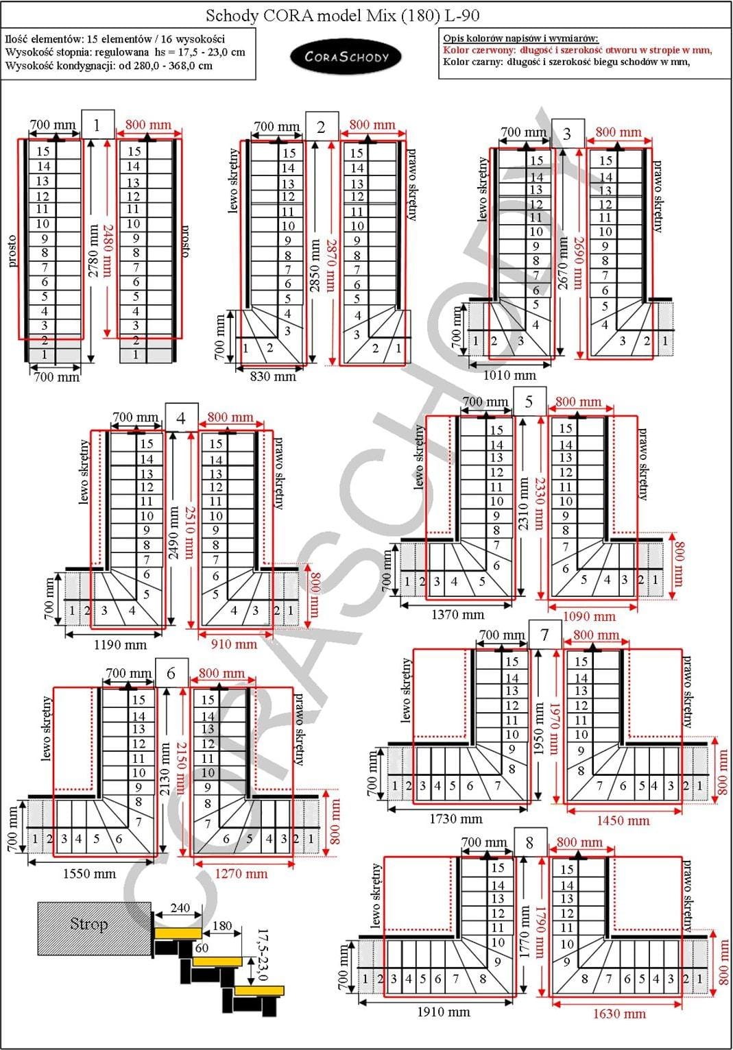 Schody Mix 08 posiada możliwość zamontowania w jednej z 28 układów, które prezentuje producent. Zabieg schodów jest w oryginalnej formie skrętny L-90, w lewo bądź w prawo, jak również nietypowego zabiegu prostego - w tym przypadku należy dodać odpowiednią adnotację do formularza.