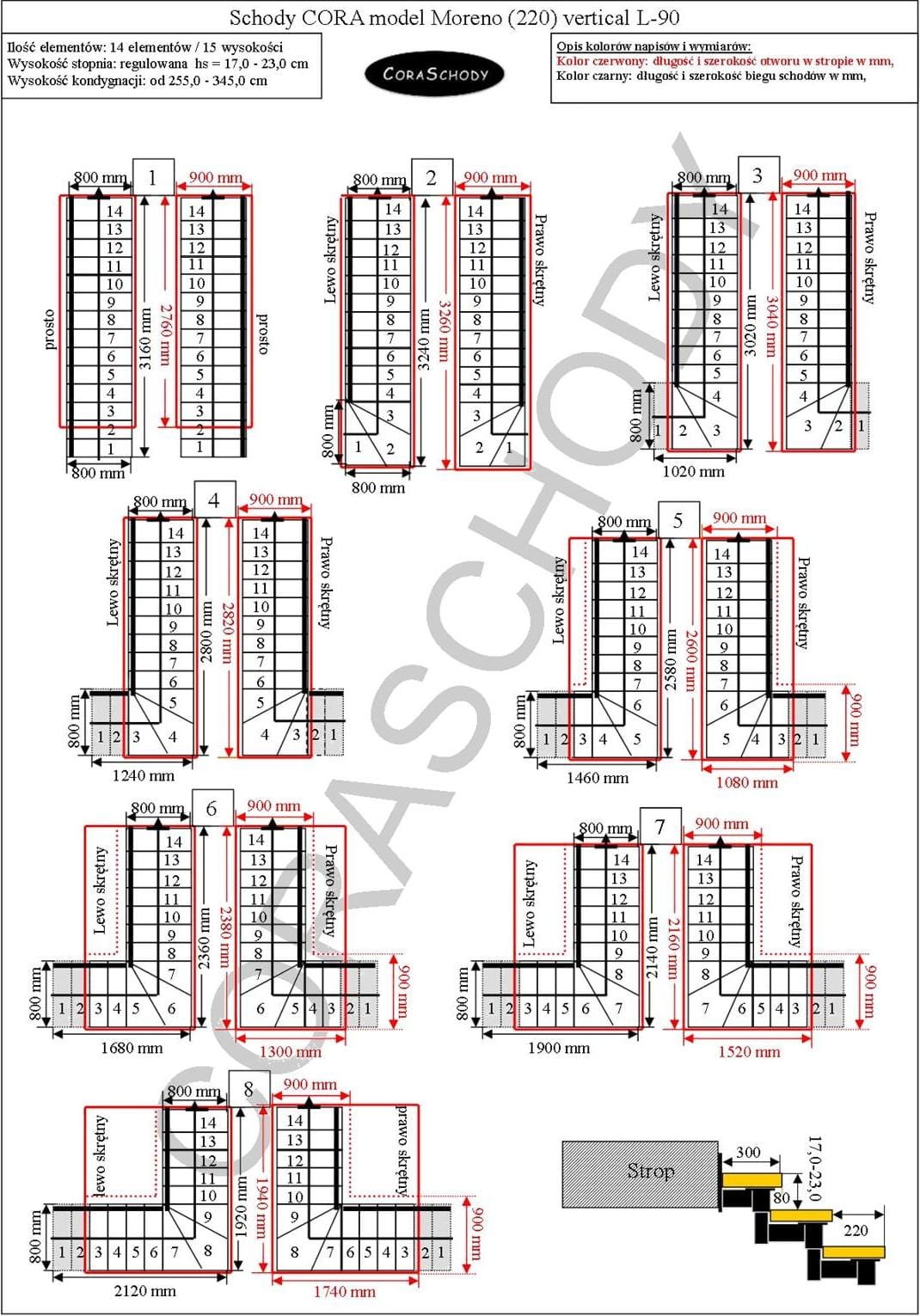 Schody Moreno 220 vertical posiada możliwość zamontowania w jednej z 28 układów, które prezentuje producent. Zabieg schodów jest w oryginalnej formie skrętny L-90, w lewo bądź w prawo, jak również nietypowego zabiegu prostego - w tym przypadku należy dodać odpowiednią adnotację do formularza.